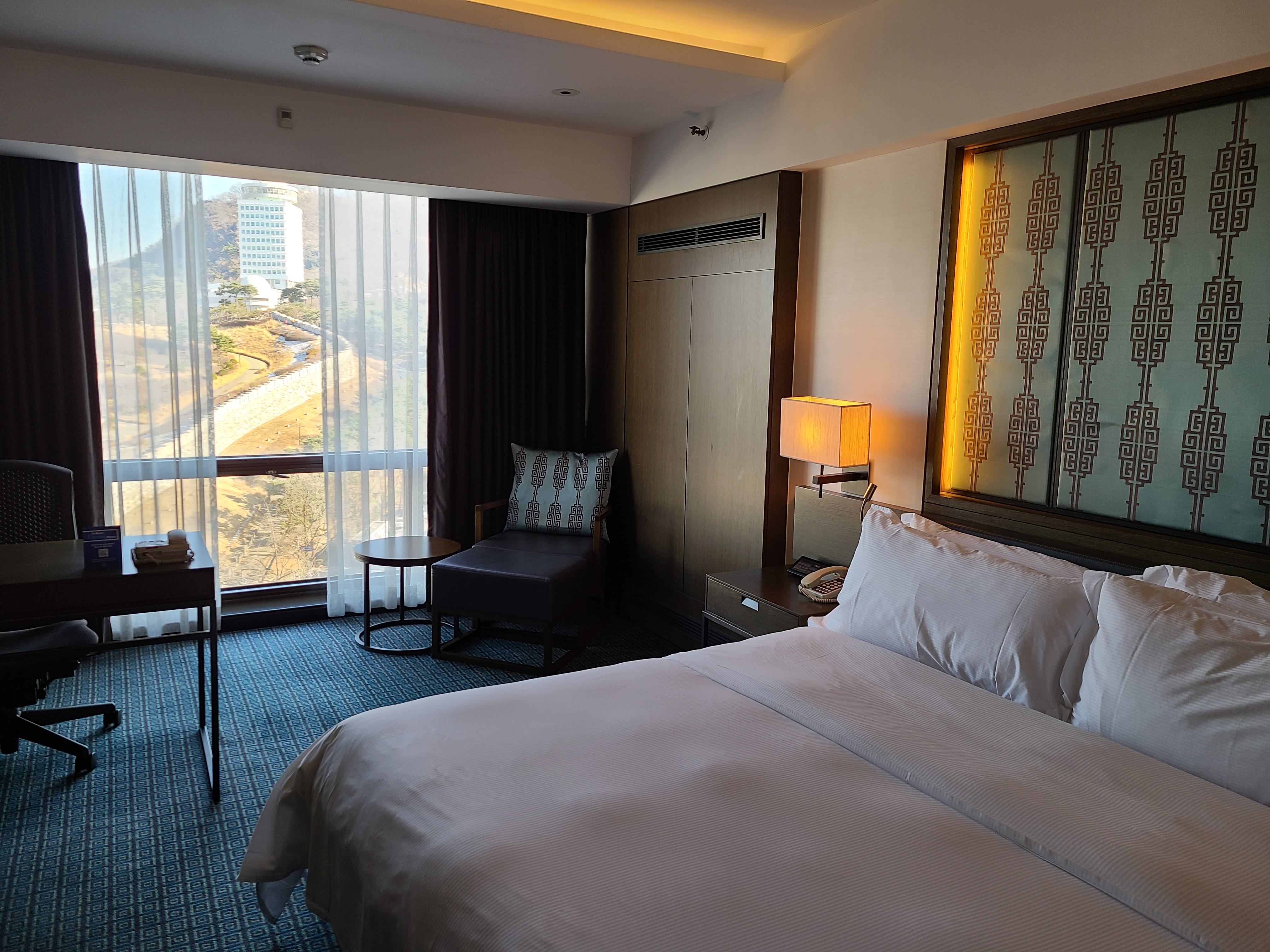 가기 전 코로나로 인해서 수영장을 이용할 수 없다는 내용을 확인하고 아쉬웠지만 호텔에서 방역 지침을 잘 지키고 관리하고 있다는 생각이 들어 오히려 믿음이 갔다. 수영장을 이용하지 못하는 아쉬움은 반신욕으로 대신하려고 입욕제를 준비하고 체크인을 했다. 결혼기념일 찬스 덕분에 오후 2시 얼리 체크인을 할 수 있었고 방은 14층으로 배정 받았다. 우리 집 식구는 더 고층을 배정 받지 못해서 아쉬운 듯 했지만 14층 뷰도 훌륭했다.