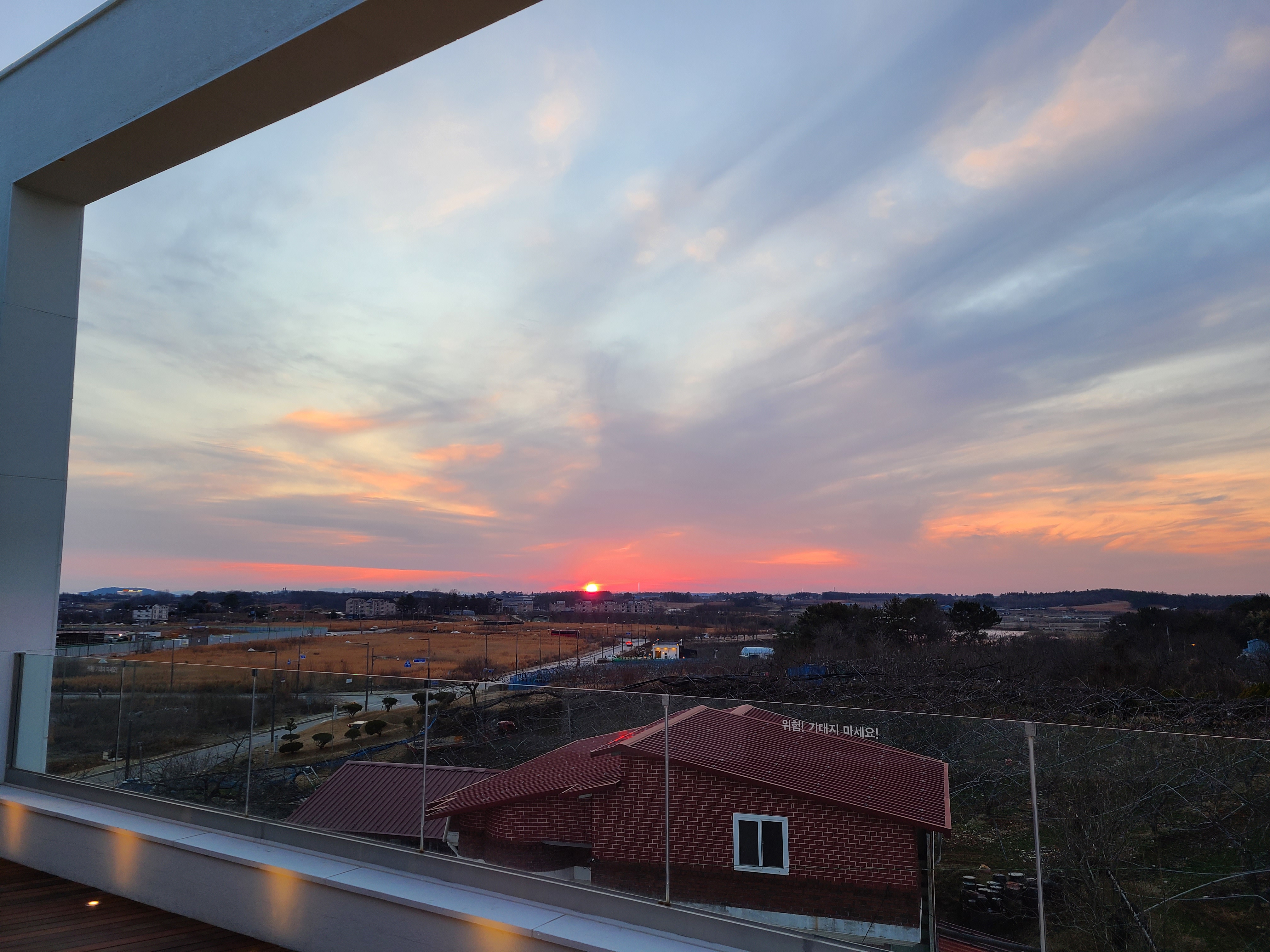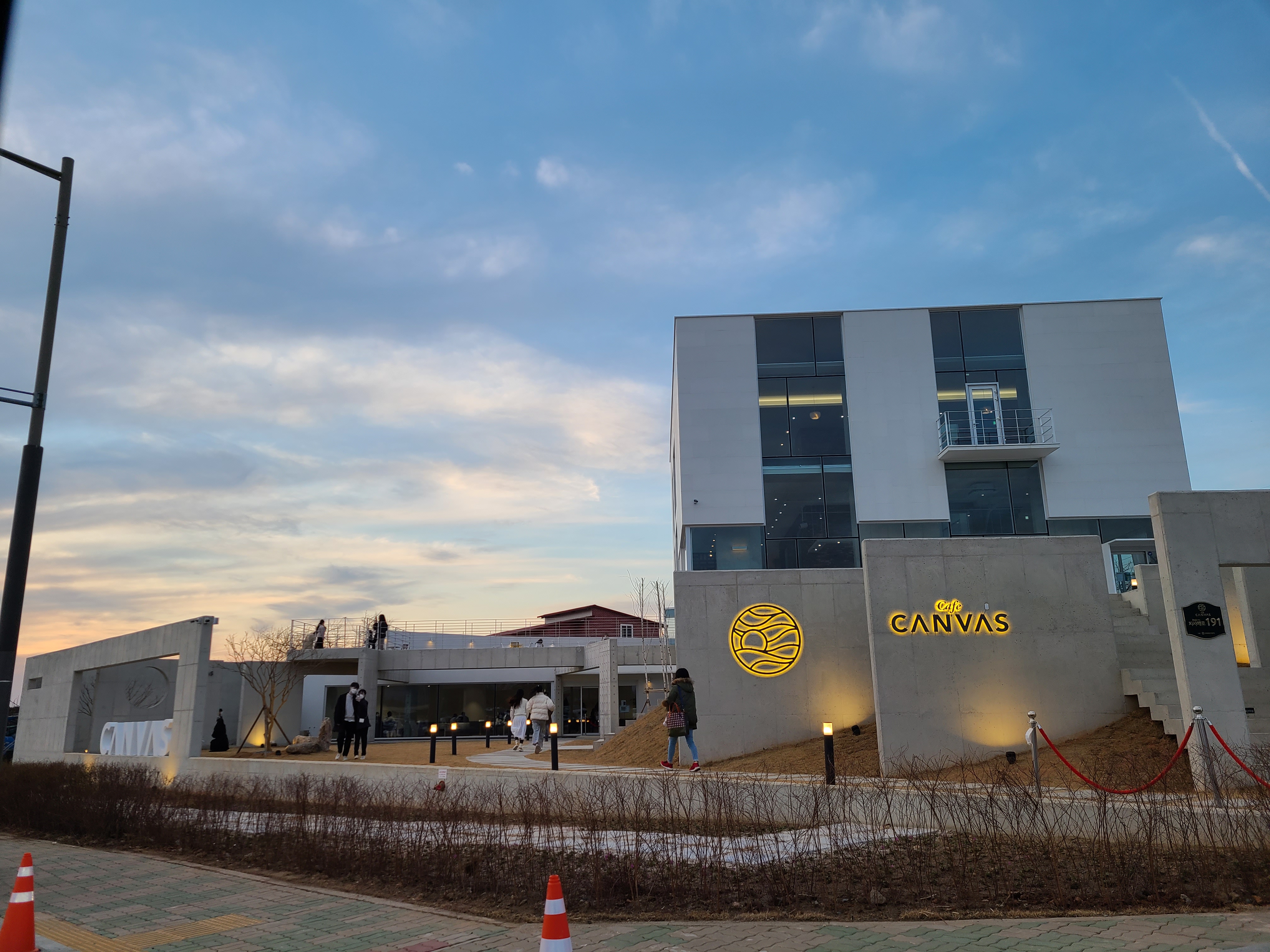 비비정을 나와 석양이 지는 모습을 보기 위해 캔버스 카페로 이동했다. 캔버스 카페 앞에 처음 도착했을 때 규모가 크다라는 생각이 들었다. 코너를 돌아 주차장으로 들어서면서 본 캔버스 카페의 모습이란 여기가 왜 인스타 핫플인지 이해할 수 있었다. 구석 구석 사진을 찍을 만한 포토 존이 구성되어 있었고, 통 유리 창으로 건물이 구성되어 있어서 탁 트인 풍경을 즐길 수 있었다. 우리가 방문 한 시간 대가 딱 석양이 지는 타이밍이어서 아름다운 석양을 원 없이 감상했다.
