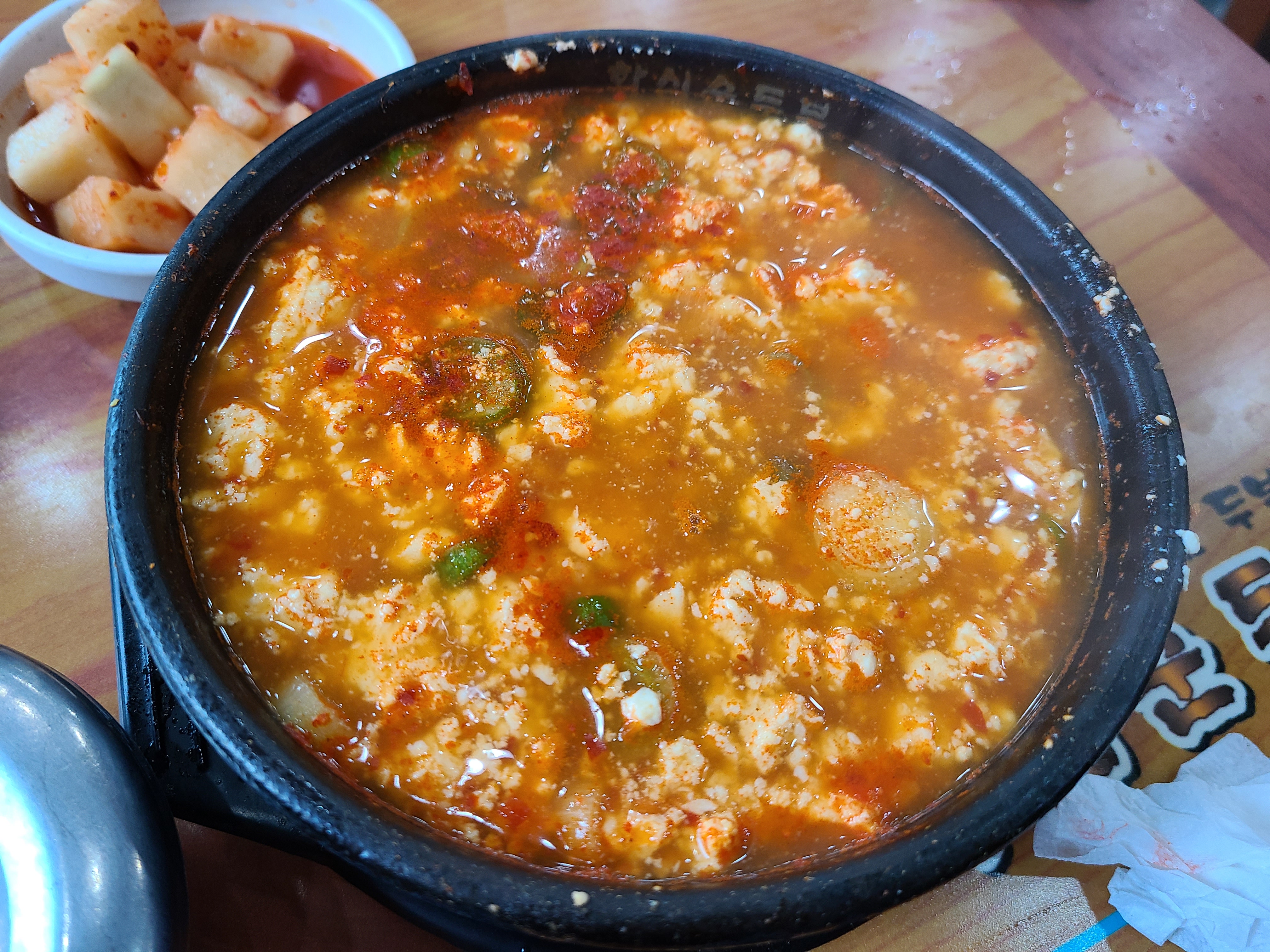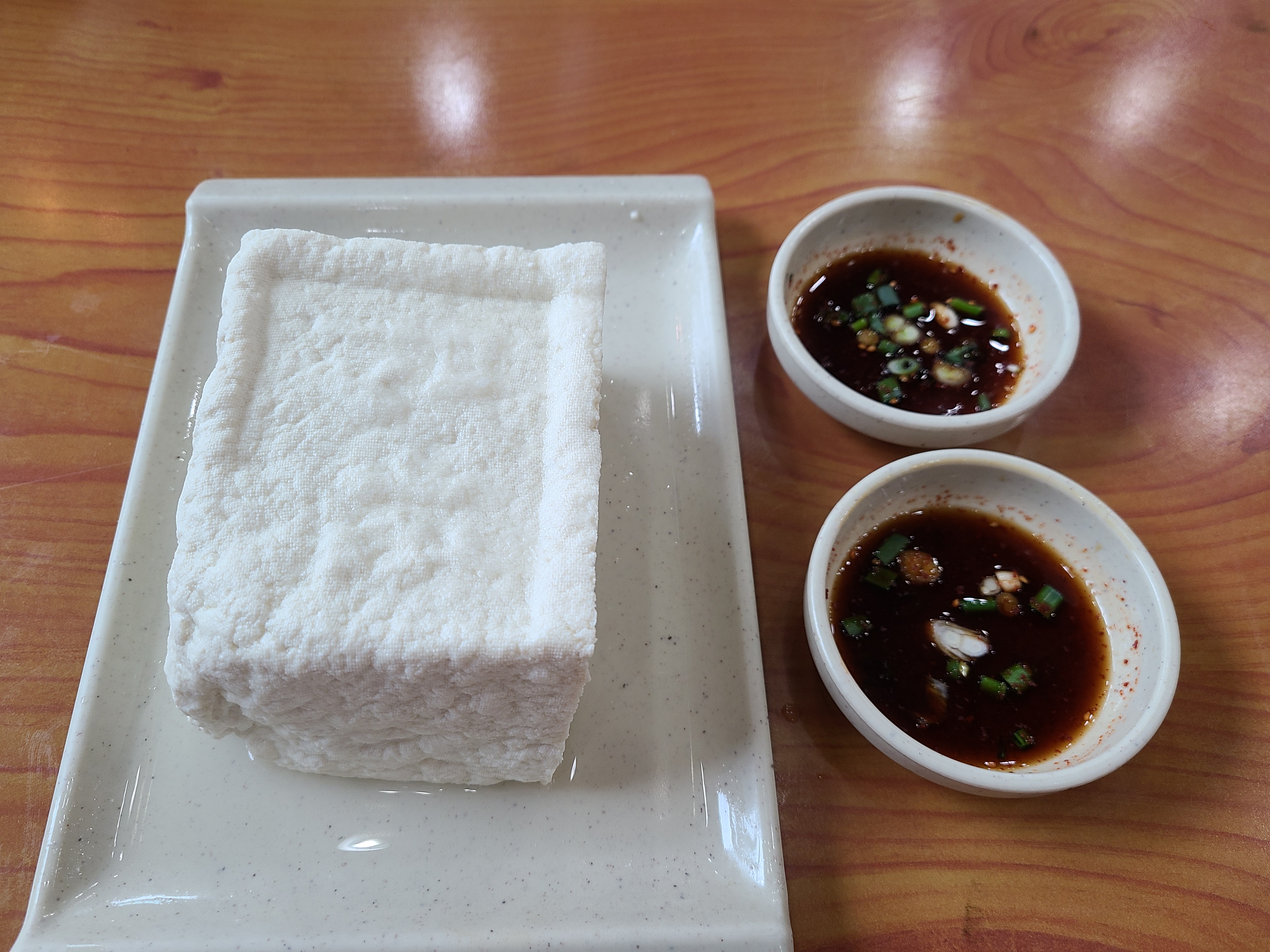편백나무 숲 산책을 마치고 돌아와 짐을 챙겨 원조화심순두부로 아점을 먹으러 갔다. 완주에서 방문했던 곳 중 가장 많은 사람을 구경한 곳이 아닌가 싶다. 식당의 규모는 상상 이상이었다. 우리 집 식구는 어린시절 예식장 피로연 장에 온 것 같다고 했다. 자리에 앉자 마자 정신없이 주문을 했다. 손 두부 한 모와 화순 순두부, 바지락 순두부를 주문했다. 배도 고팠지만 손 두부의 맛은 정말 최고였다. 식당에서는 한 모에 5,000원이나 포장 시에는 3,000원이었다. 화순 순두부와 바지락 순두부 안의 순두부 양이 굉장히 많았다. 돼지고기를 좋아하지 않는 나는 바지락 순두부를 시켰지만 시그니처인 화순 순두부의 맛이 개인적으로는 더 입맛에 맞았다. 식사를 마치고 두부 2모와 두부 도넛도 구매했다.