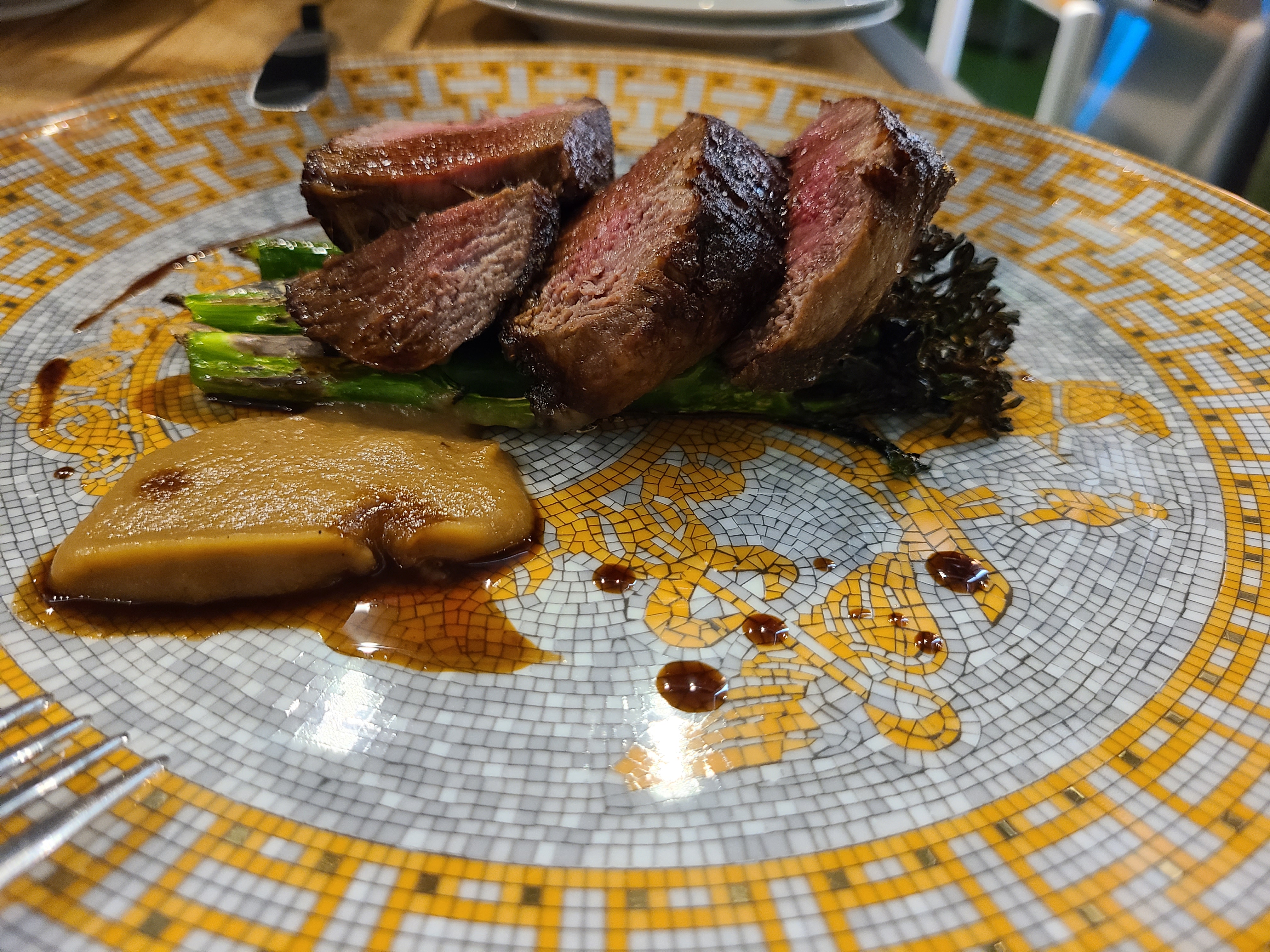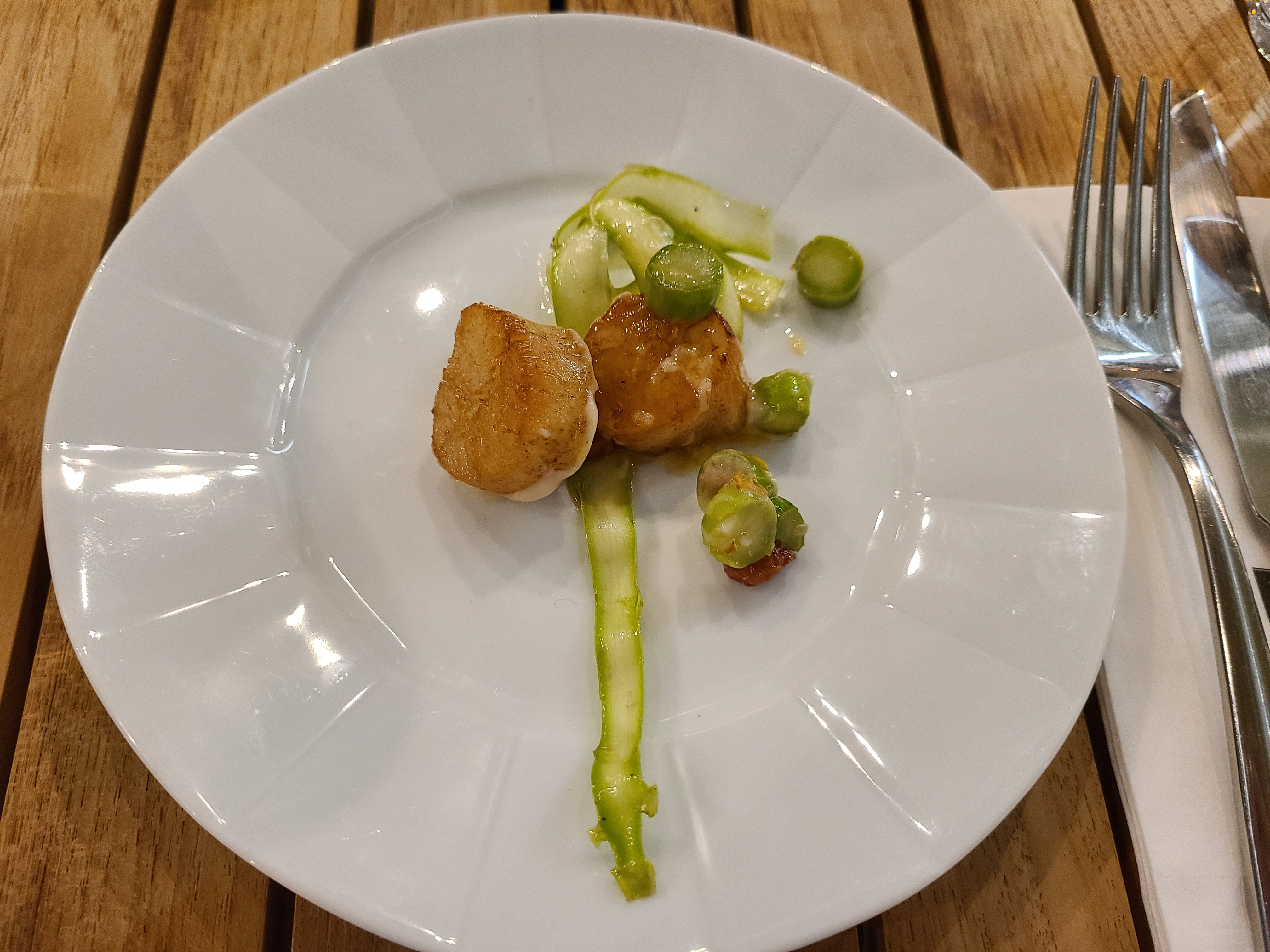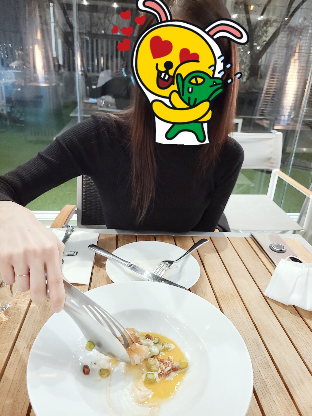 나는 한강 뷰를 우리 집 식구는 불 멍을 때리는 사이에 첫 번째 요리가 나왔다. 구운 아스파러거스와 관자, 유자소스의 비주얼에 반하고 맛에 또 한번 반했다. 관자의 익힌 정도도 적당해 식감이 매우 훌륭했다. 우리 집 식구와 감탄을 하며 맥주를 주문했다. 맛있는 음식을 먹으니 모든 아쉬움이 날아갔다.