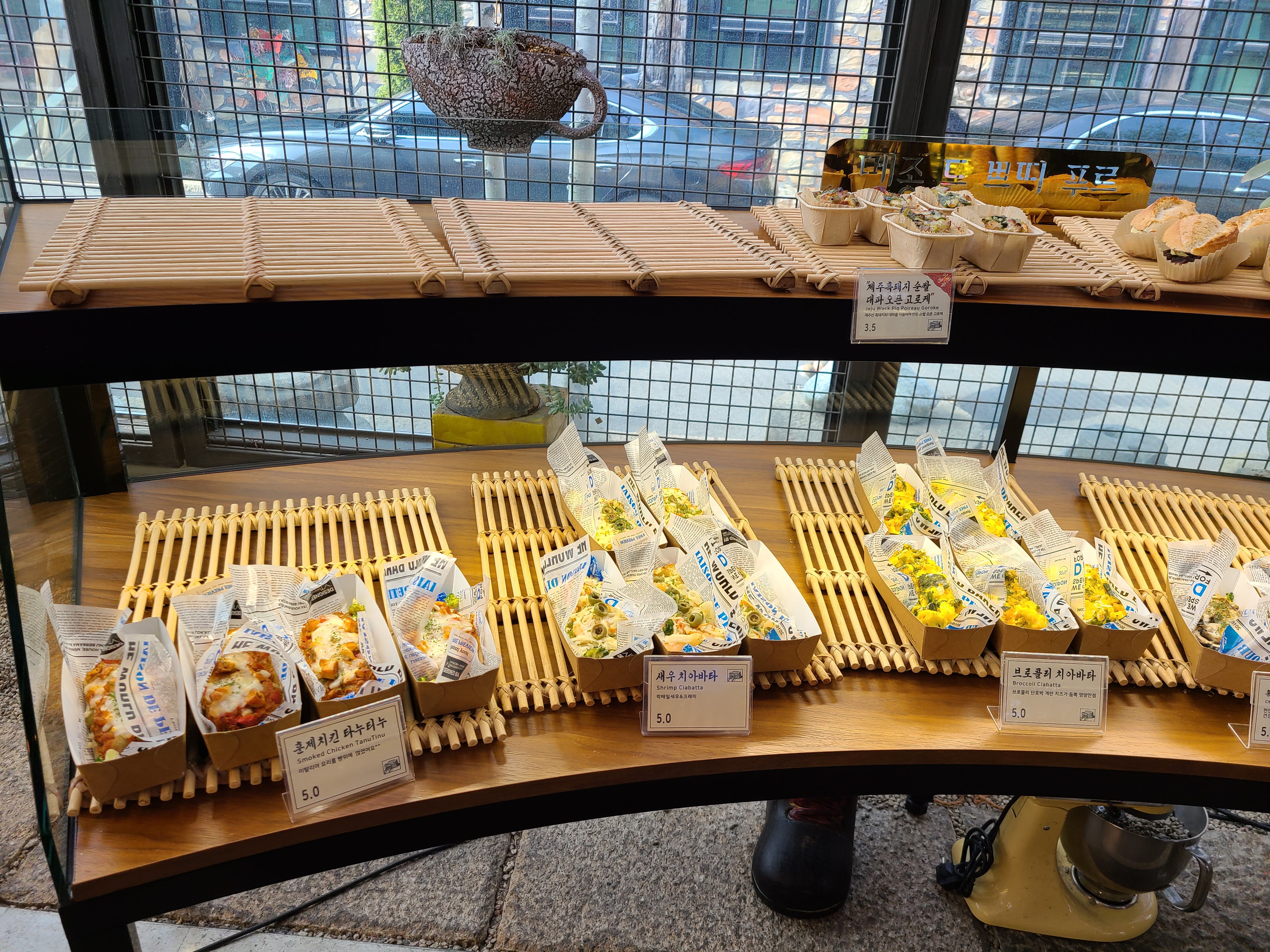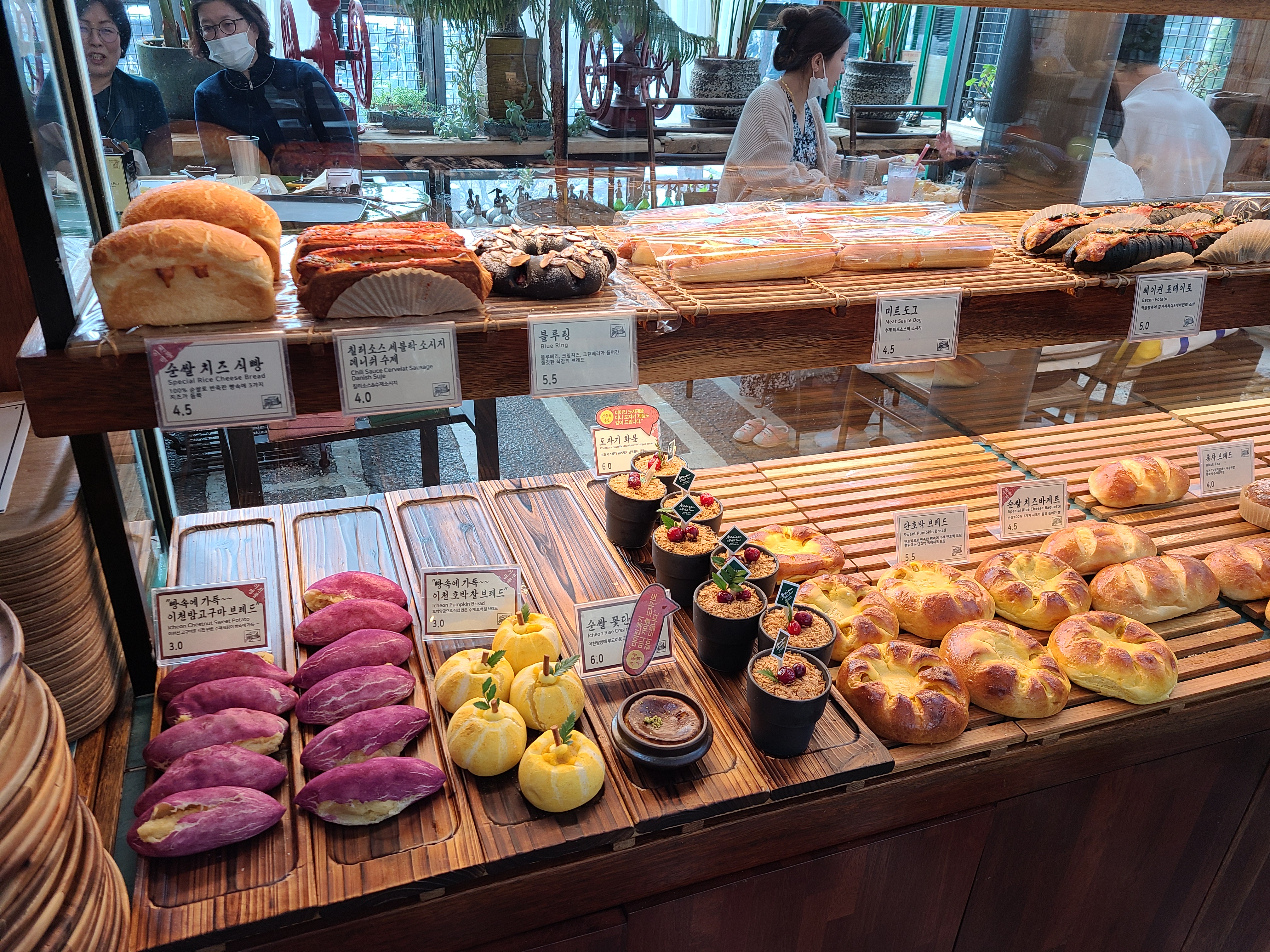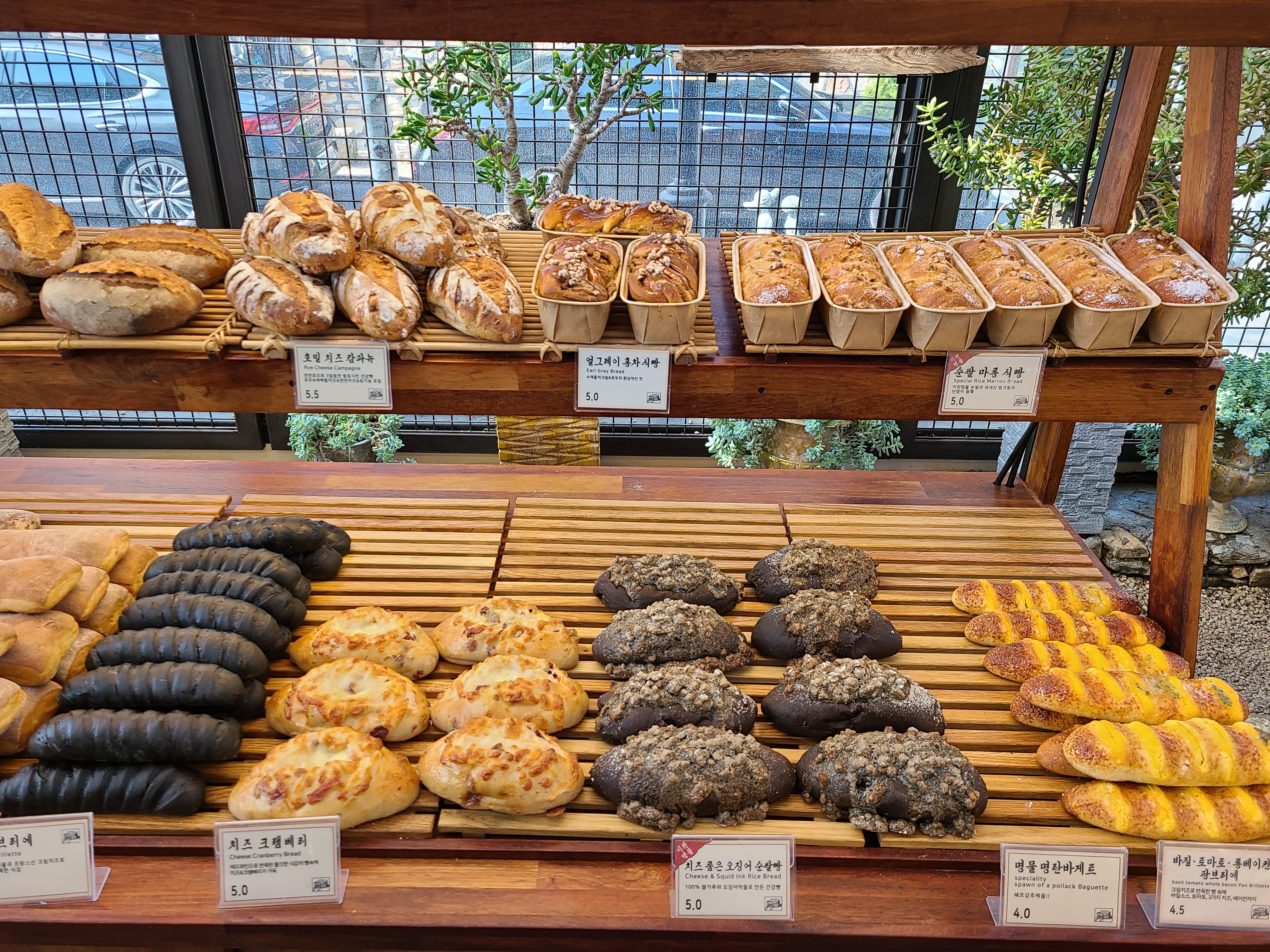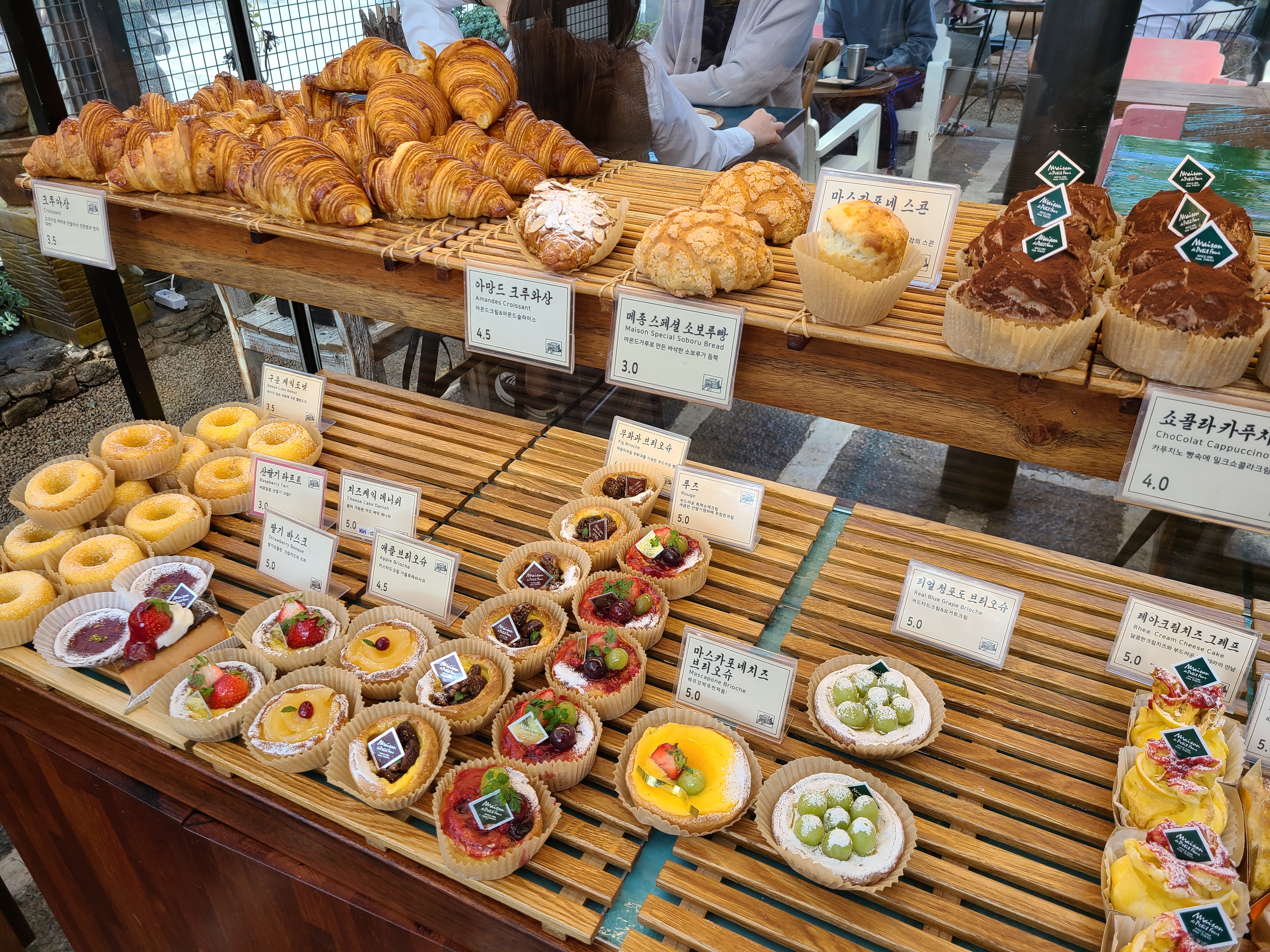 빵의 종류가 정말 다양해서 구경하는 즐거움이 있었다. 순쌀 꽃단지, 순쌀 밥 한 공기, 도자기 화분이라는 메뉴는 담겨 있는 도자기 용기를 가져갈 수 있는 점도 재미있었다. 오후 3시가 넘은 시간이었는데 주방에서 새로 만든 빵이 계속 진열되고 있는 것을 보니 회전율이 좋은 것 같았다. 이진상회 안의 베이커리는 제주도 방지 순례의 성지인 '메종 드 쁘띠 부르'가 입점하여 운영 중에 있다. 이효리 단골 빵집으로 유명하다고 한다. 밥을 먹은 지 얼마 안 되었지만 순쌀 꽃단지와 앙버터를 구매했다. 다음번에 방문한다면 밥을 먹기 전 방문해서 다양한 종류의 빵을 맛보고 싶다.
