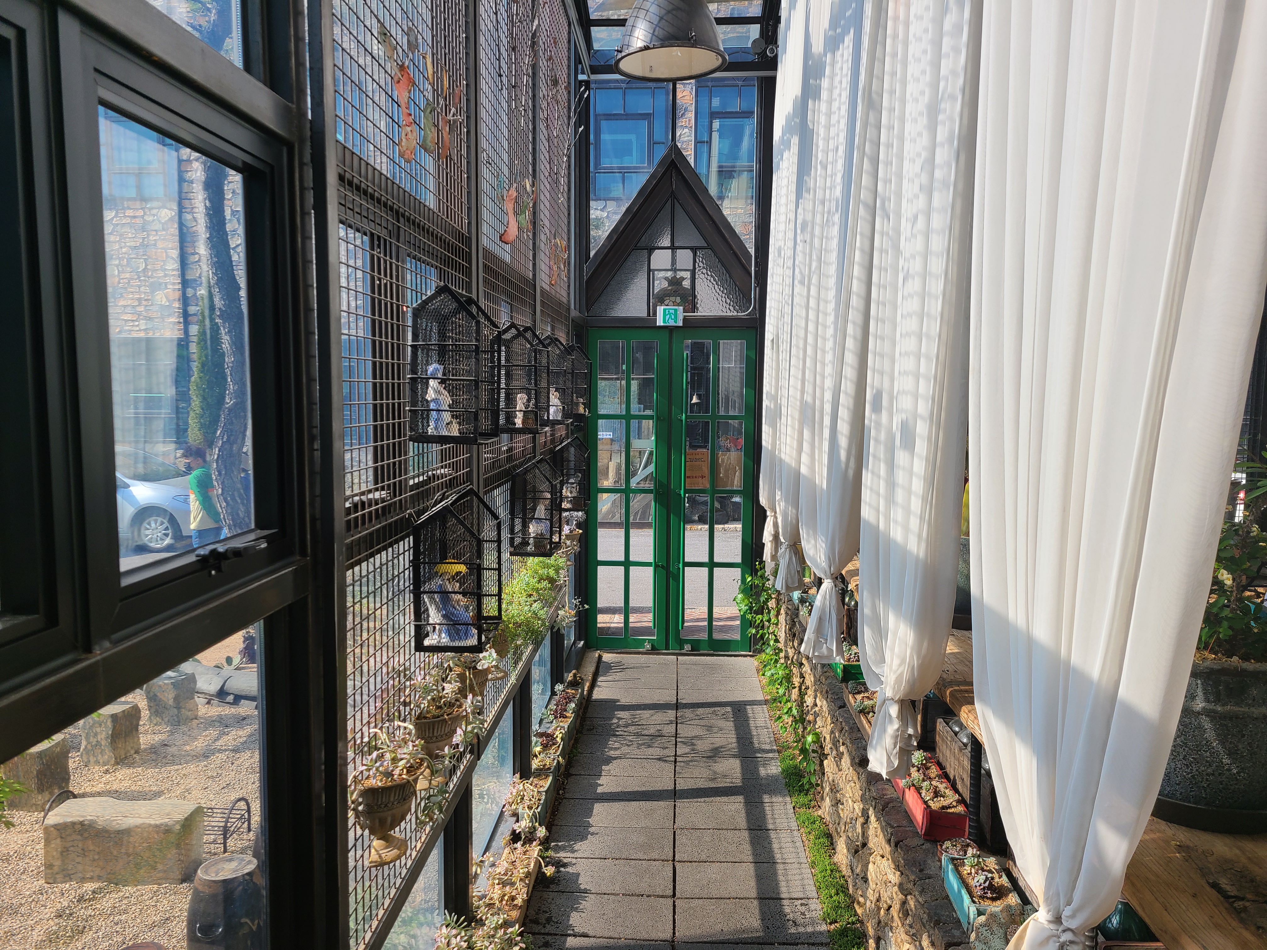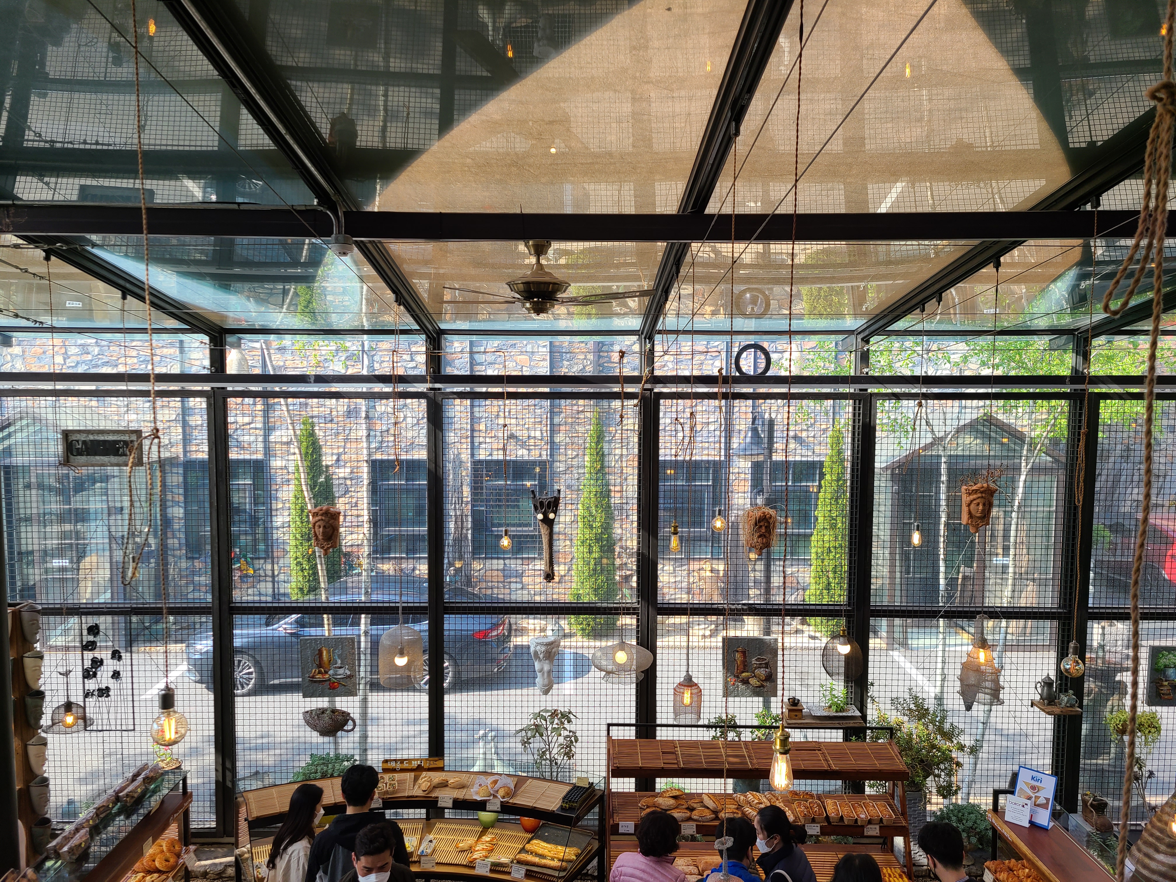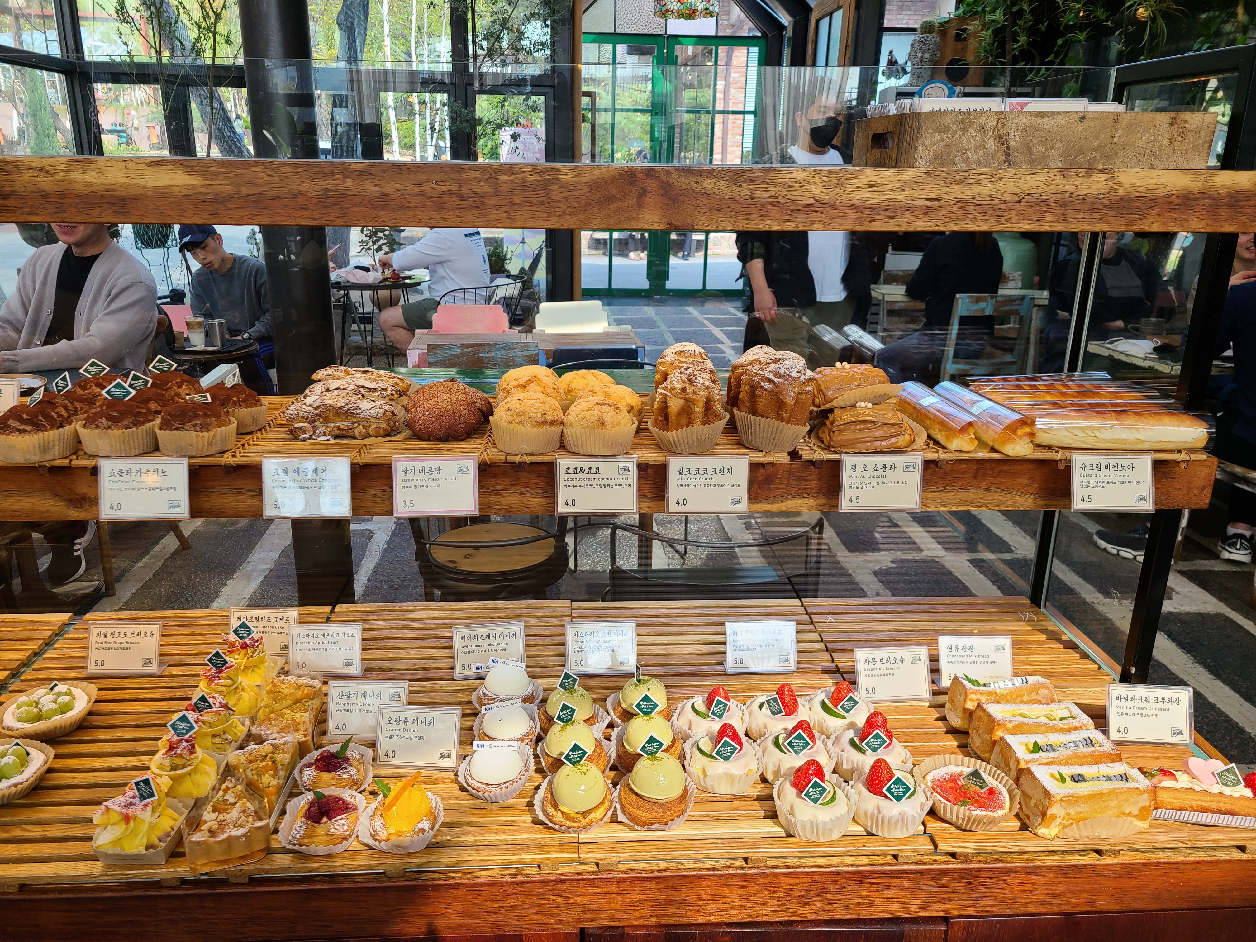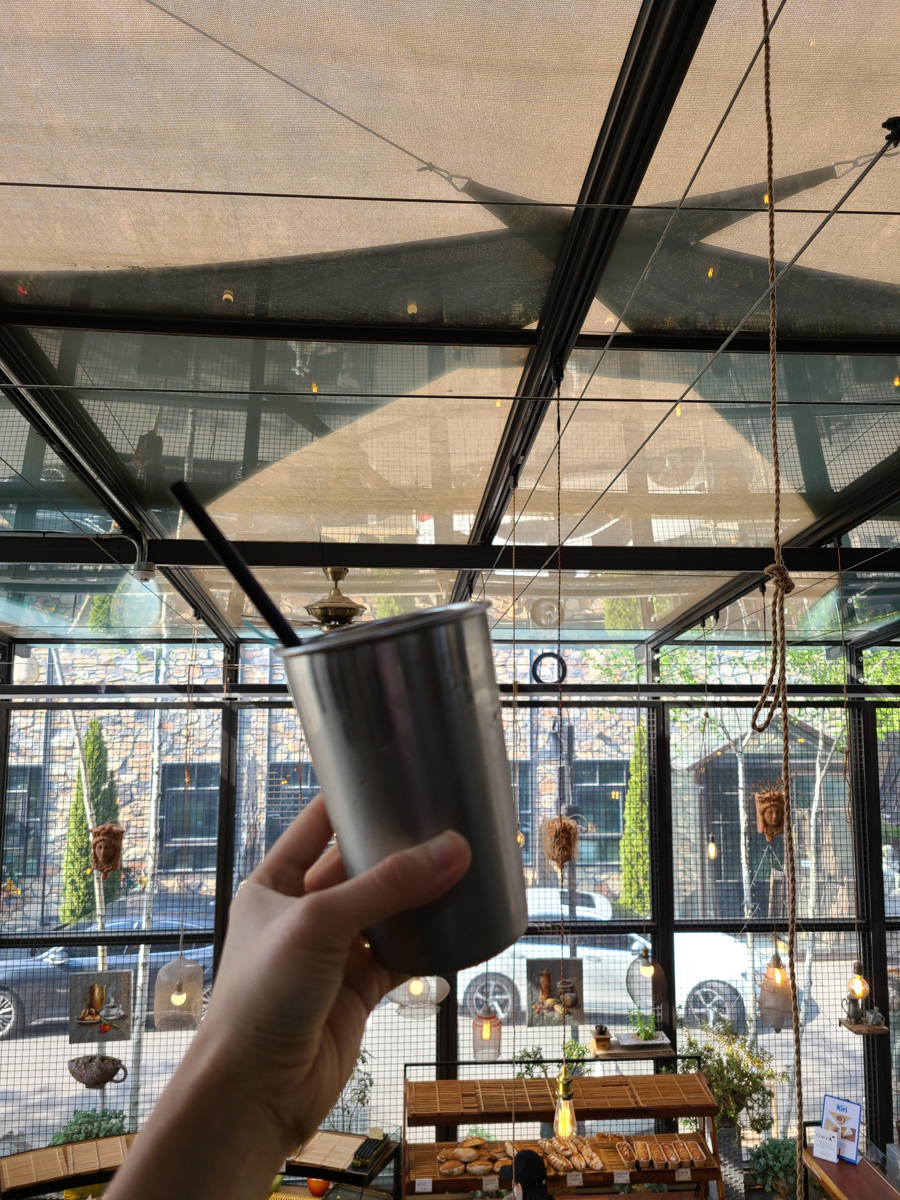 빵과 음료를 주문하기 전 우리 집 식구와 카페를 돌아보기로 했다. 온실 같은 카페 안으로 들어가니 테이블이 곳곳에 놓여있었다. 생각보다 사람이 많지 않았고, 테이블이 워낙 많아 카페 안에서 빵과 음료를 먹어 보기로 했다. 1층이 내려다보이는 곳에 자리를 잡고 빵과 음료를 주문하기 위해 1층으로 이동했다.