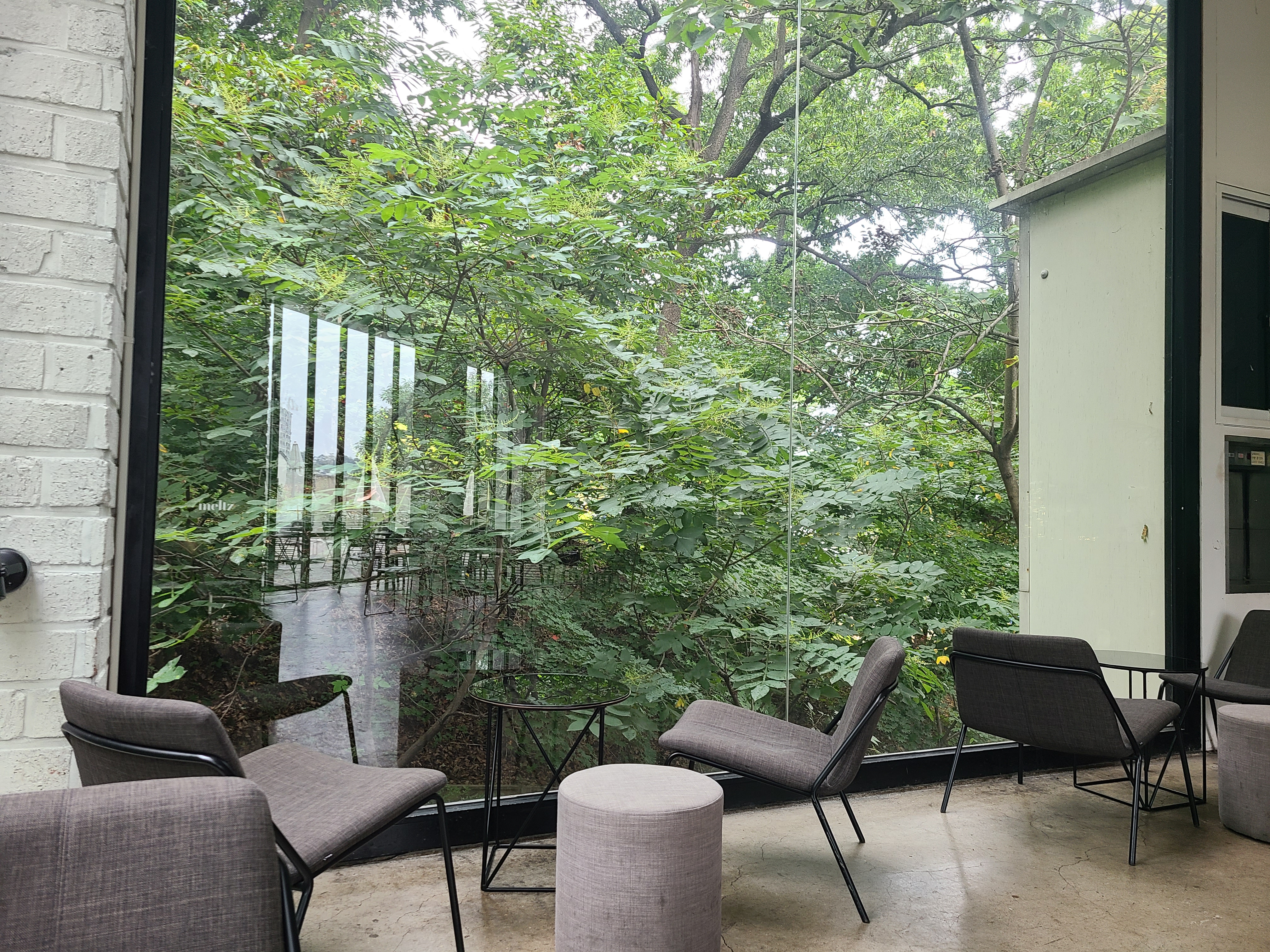 이때는 몰랐다. 우리가 앉은 자리가 그렇게 인기 있던 곳이라는 것을 1층에 남은 나는 커피와 브런치 메뉴를 주문했다. 가격은 저렴한 편은 아니다. 맛과 양을 모두 생각했을 때 음료만 주문했다가 베이커리 류를 주문하는 게 나을 뻔했다는 생각을 했다. 2층에 올라 간 순간 통유리의 푸릇푸릇 한 숲을 볼 수 있다는 것만으로 정말 잘 왔라는 생각을 반복했다. 우리 집 식구와 각자 시간을 가지며 커피를 마시고 있으니 여유와 휴식이 이런 거구나라는 생각이 들었다. 그렇게 20분 정도 시간이 지나고 음식이 나왔다.