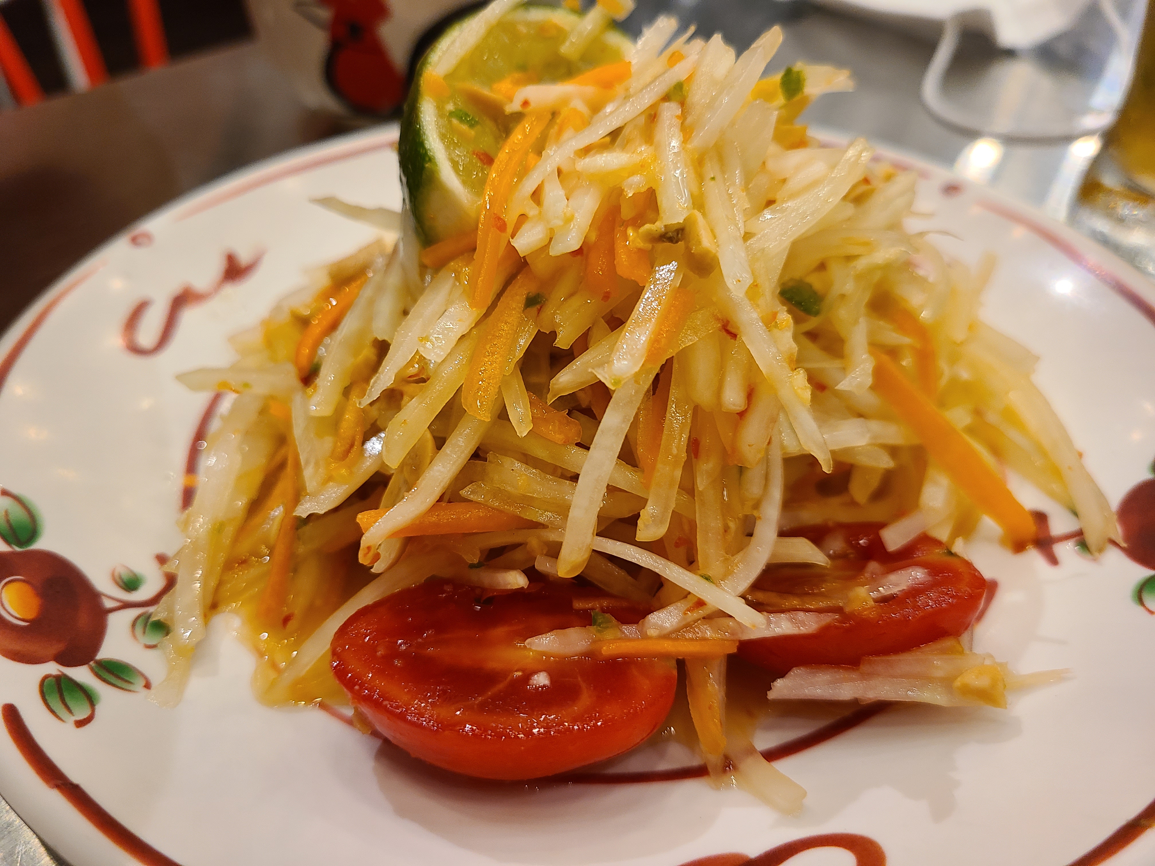 드디어 쏨땀이 먼저 나왔다. 소이연남에서 먹는 쌀국수가 느끼한 맛은 없지만 쏨땀과 함께 쌀국수를 먹으면 더욱 깔끔한 맛을 즐길 수 있기에 쏨땀 주문을 추천한다. 유난히 쏨땀을 좋아하는 우리 집 식구는 비주얼에 한번, 그 맛에 한번 감탄했다.