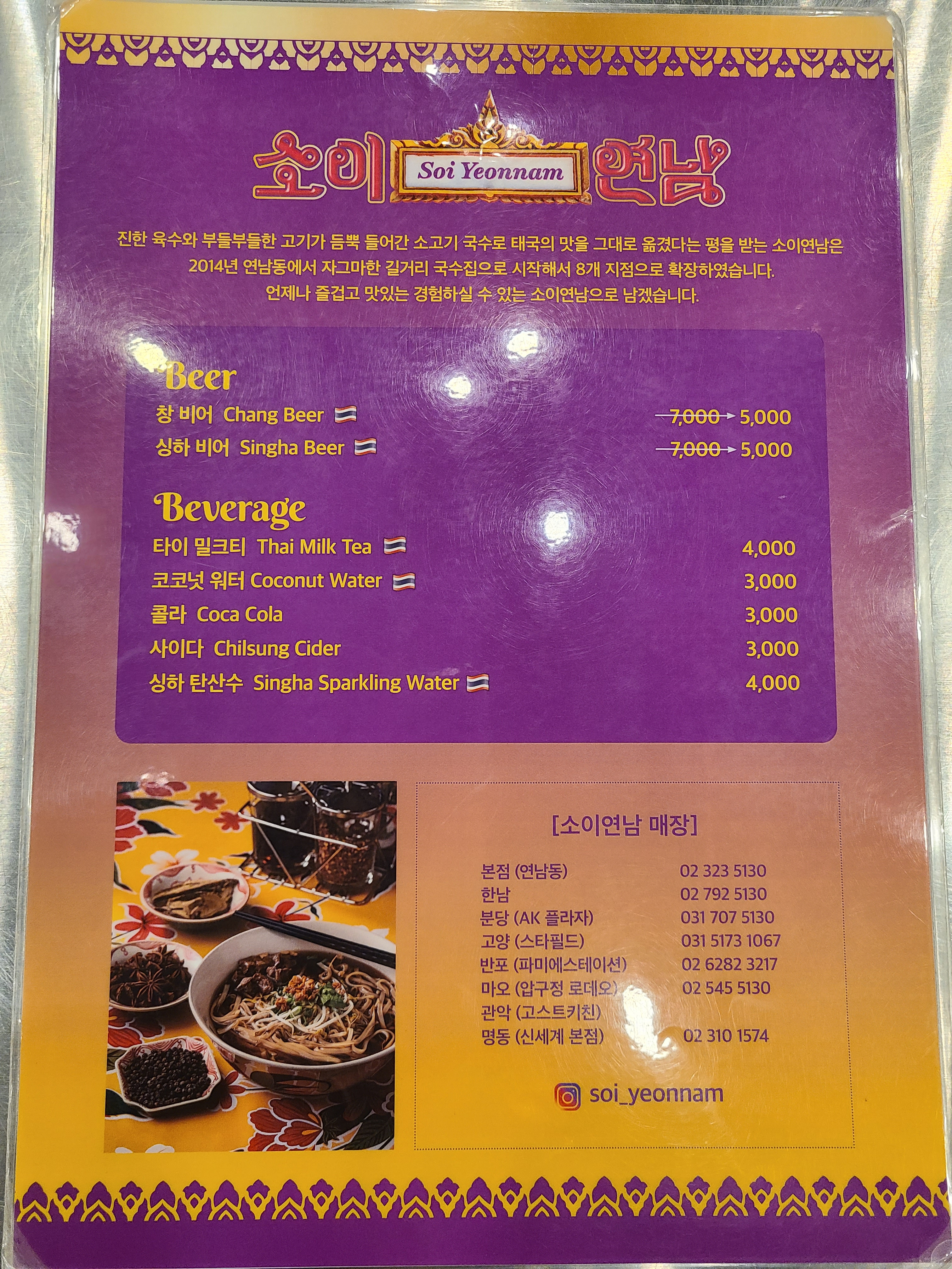 늘 소이연남을 방문할 때면 웨이팅이 보통 30분 이상이었는데, 코로나로 인해서인지 바로 입장할 수 있었다. 메뉴는 소고기국수(9,500원), 소이뽀삐아(13,000원), 쏨땀(12,000원), 수육(20,000원)으로 단출한 편이다. 대식가인 우리 둘은 세트메뉴 B로 소고기국수 2개, 소이뽀삐야, 쏨땀(42,000원)에 상하비어(5,000원)와 타이밀크티(4,000원)를 주문했다.