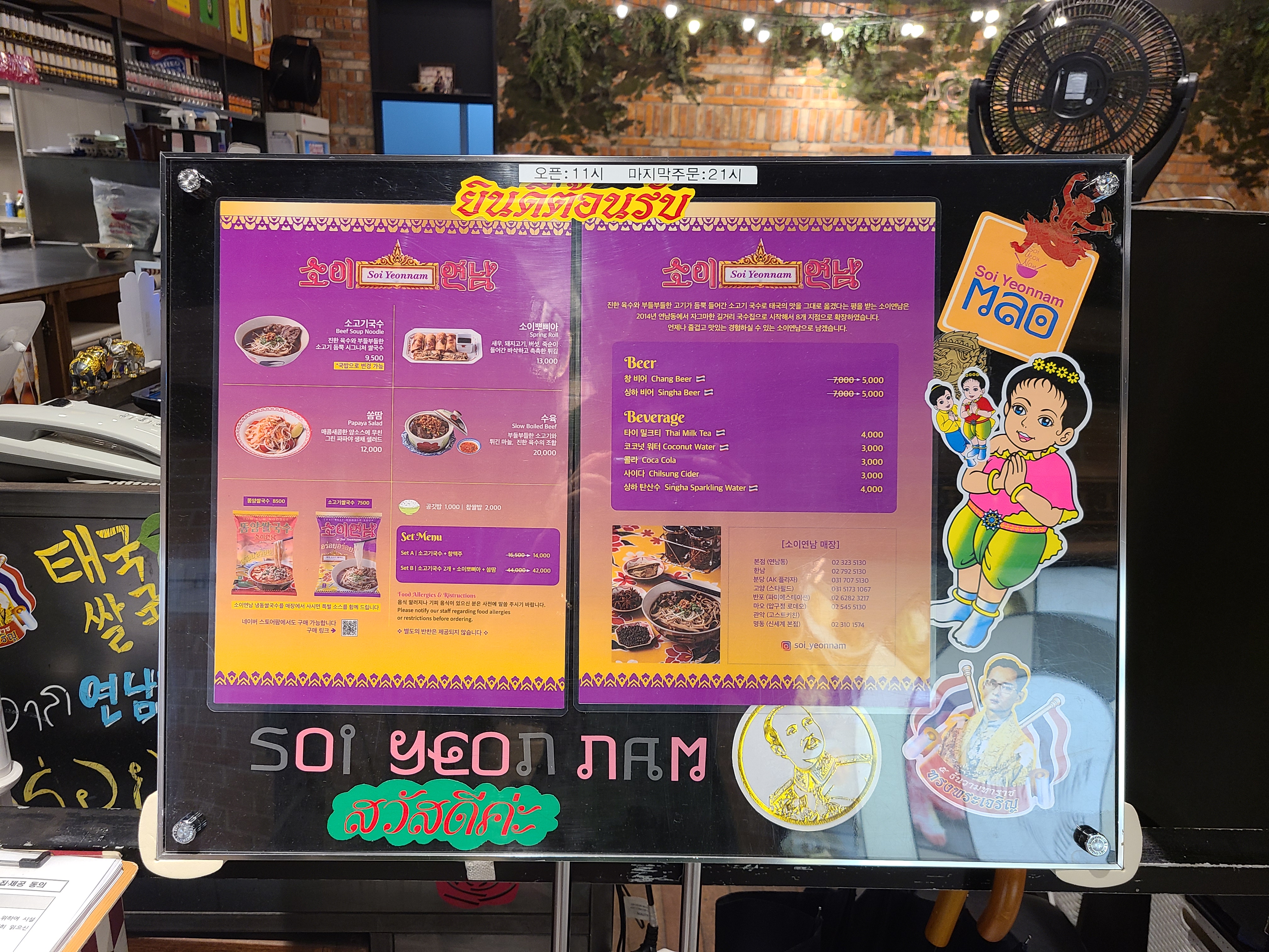 늘 소이연남을 방문할 때면 웨이팅이 보통 30분 이상이었는데, 코로나로 인해서인지 바로 입장할 수 있었다. 메뉴는 소고기국수(9,500원), 소이뽀삐아(13,000원), 쏨땀(12,000원), 수육(20,000원)으로 단출한 편이다. 대식가인 우리 둘은 세트메뉴 B로 소고기국수 2개, 소이뽀삐야, 쏨땀(42,000원)에 상하비어(5,000원)와 타이밀크티(4,000원)를 주문했다.