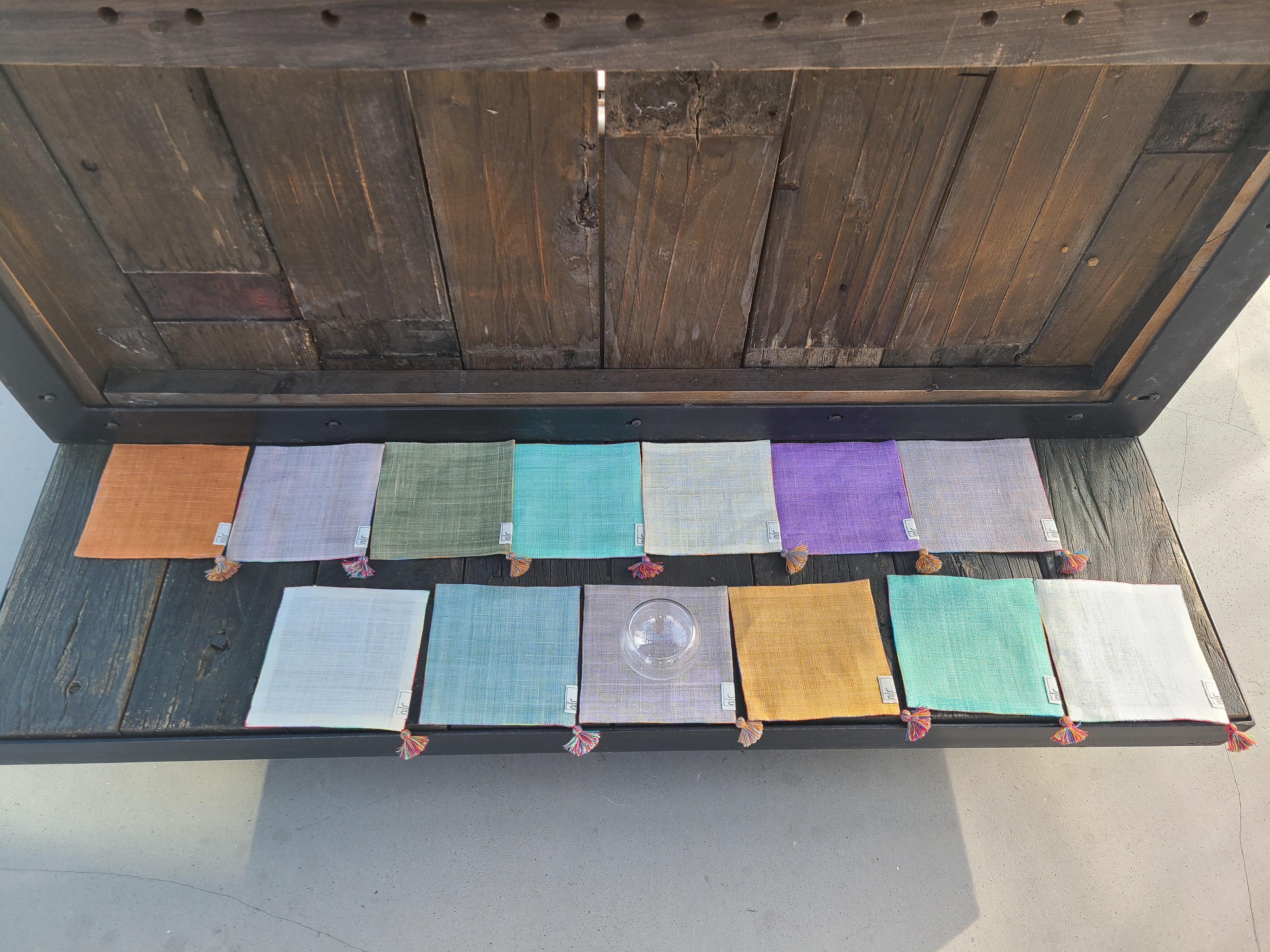 전시를 보기 위해 블루온블루에 도착해 보니 이 곳은 3년 전 우리 집 식구와 내 생일을 맞아 방문했던 곳이 아닌가~ 당시에도 카페 인테리어와 커피 맛이 인상적이었는데 괜스레 반가운 마음이 들었다. 카페로 입장 후 QR 체크인을 하자마자 온실로 향했다. 온실에서 하는 전시는 어떤 느낌일까 몹시 궁금했다. 온실로 이동하는 카페 출구에는 전시 포스터와 전시 안내, 바느질 키트, 고운 천 샘플이 놓여있었다. 고운 천 샘플을 보고 있으니 전시에 대한 기대감이 생겼다.