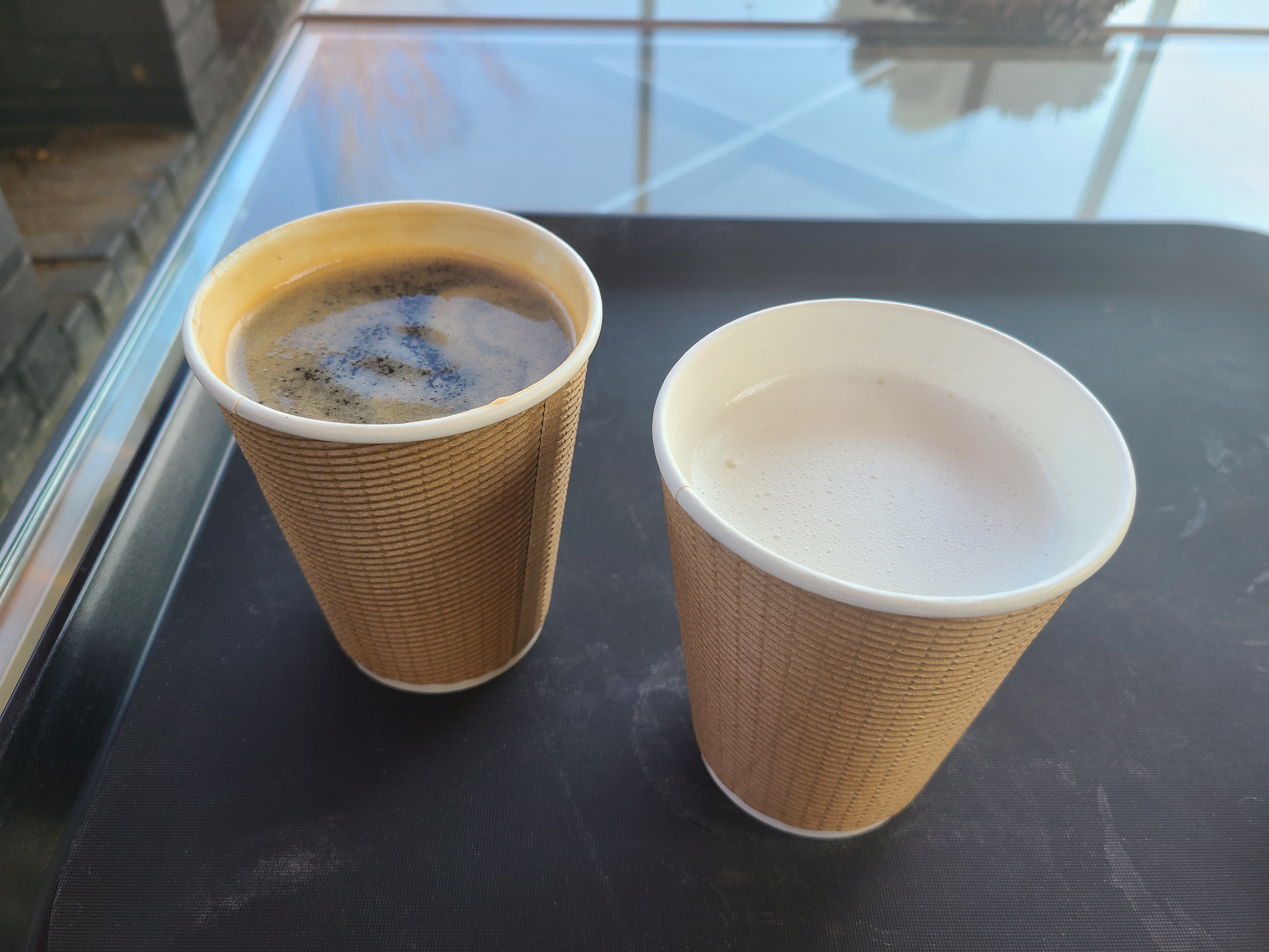 우리 집 식구는 아메리카노, 나는 뭐하농라떼를 주문했다. 테이크아웃 잔과 빨대가 생분해 컵이라니 착한 소비를 하고 있는 듯한 느낌이 들었다. 난로 옆에 자리를 잡고 아메리카노와 뭐하농라떼를 즐겼다.
