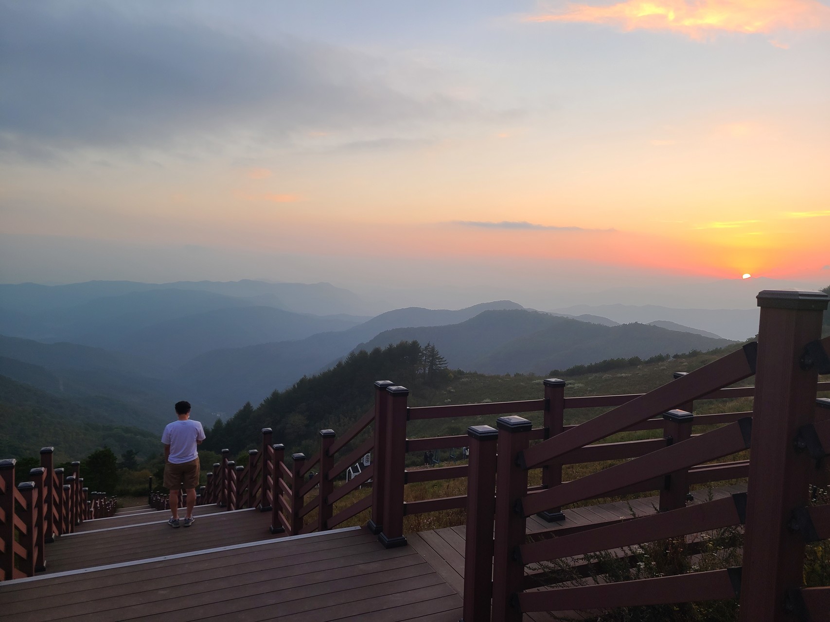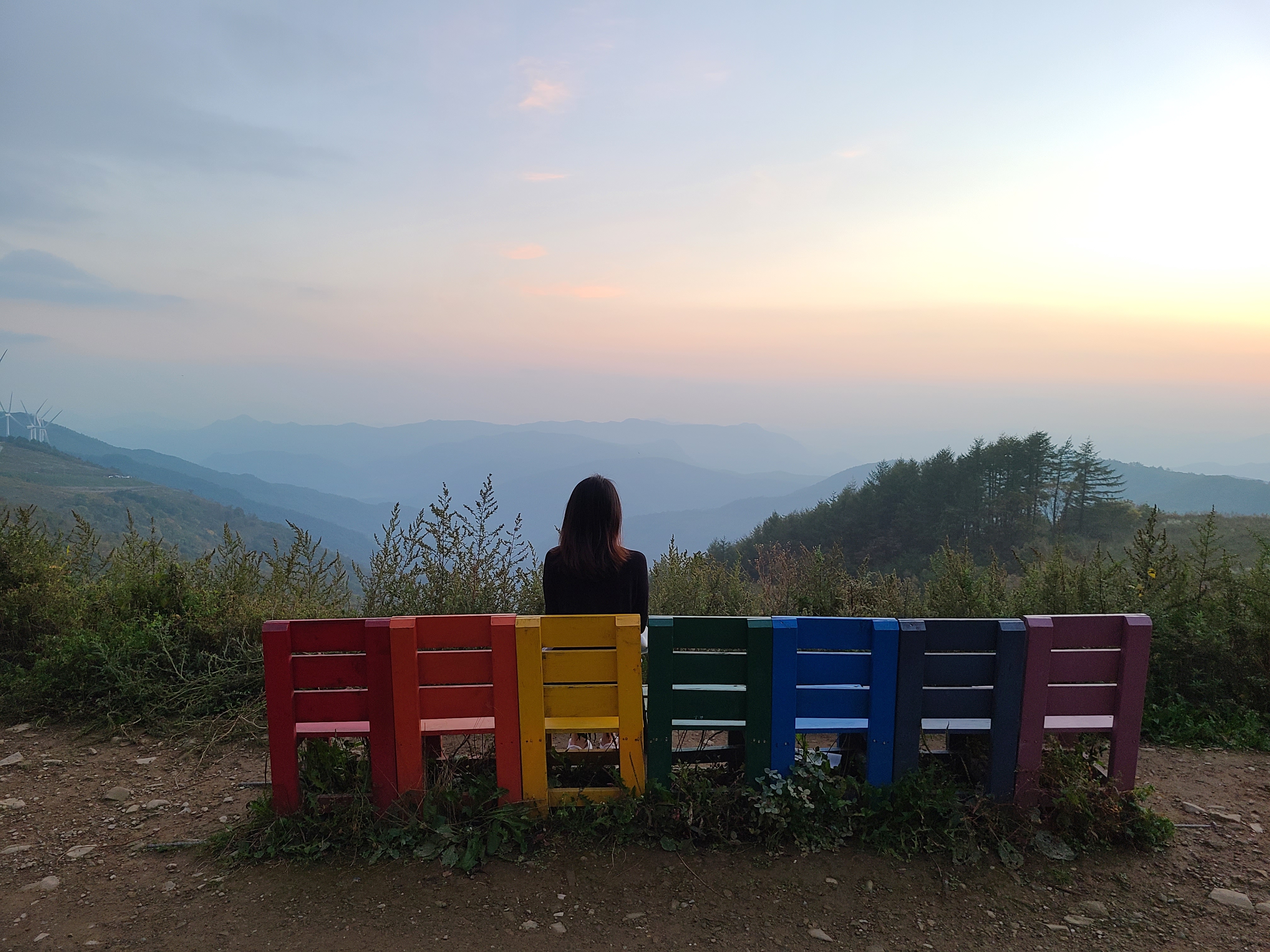 첫 번째 장소로 소개할 곳은 육백마지기이다. 늦여름 어느 날 갑작스레 떠났던 육백마지기, 이곳은 연애시절부터 우리 집 식구가 늘 다녀오고 싶어 했던 장소이다. 대중교통을 이용해서 가기는 어려운 곳이었고 결혼 이후 늦여름 일몰 시간에 방문하게 되었다. 일몰의 경치도 너무 좋았지만 사진을 찍기에 적합한 시간대는 아니었다. 사진 촬영을 위해 방문한다면 데이지 꽃이 만개 한 6월 말 -7월 초 낮 시간을 이용하기를 추천한다. 사진을 찍을 만한 장소로는 미니 교회와 무지개색 의자를 추천하고 싶다.