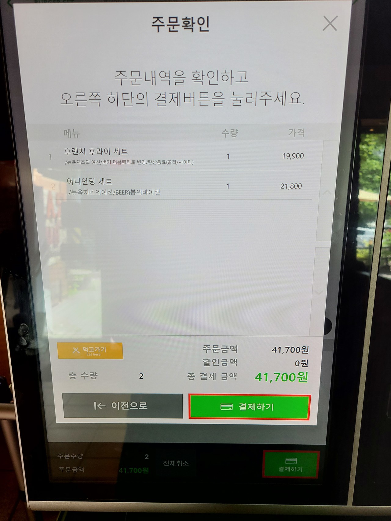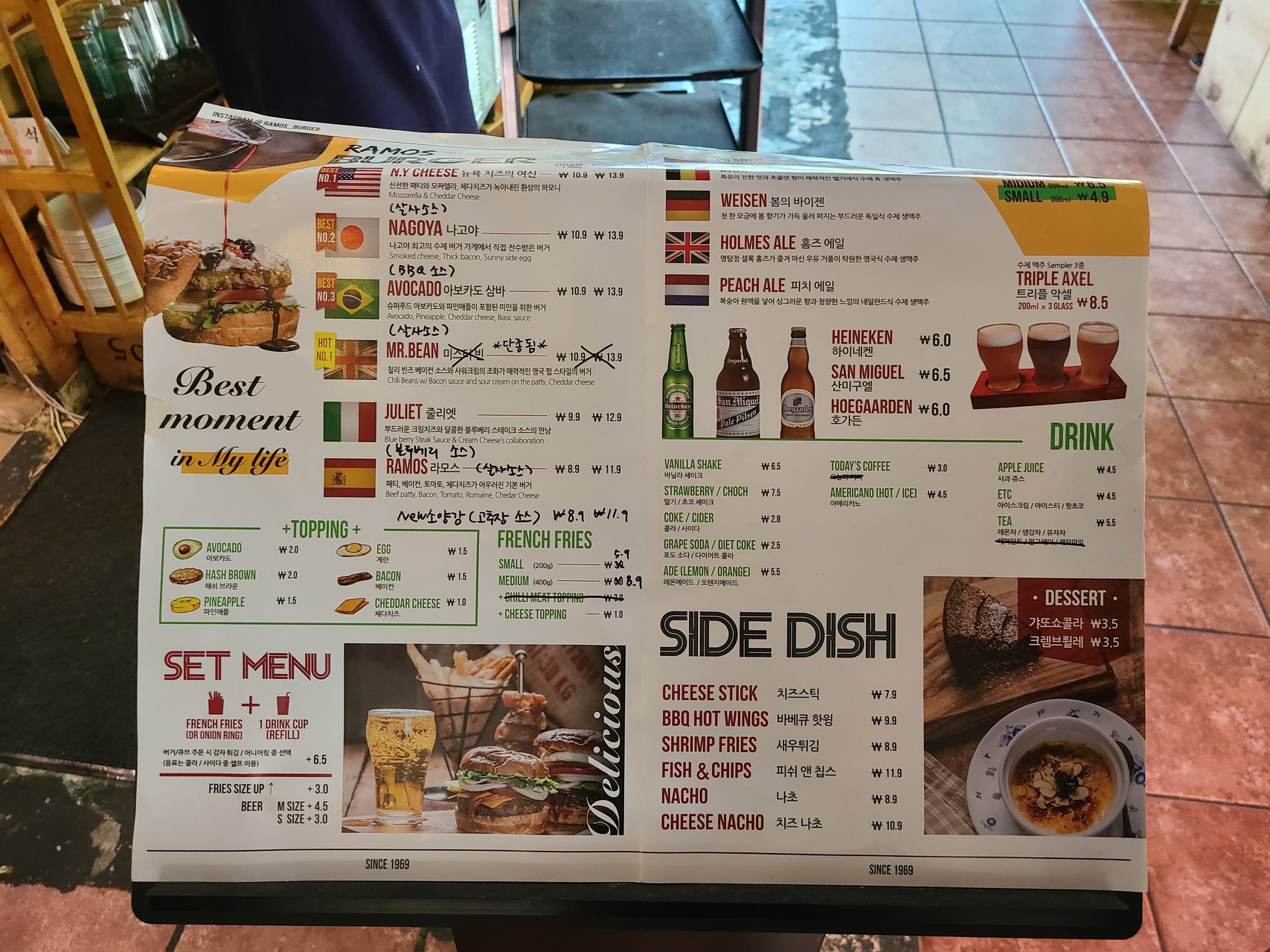 11시 30분 정도에 도착했음에도 빈자리가 거의 없었다. 테이블에 겨우 자리를 잡고 테이블 번호를 확인하고 메뉴판을 보고 어떤 메뉴를 먹을지 고민하기 시작했다. 라모스버거, 나고야버거, 아보카도버거, 뉴욕 치즈의 여신버거 모두 먹고 싶었다. 먹고 싶다고 모두 주문할 수 없기에 아쉬움을 뒤로하고 나는 뉴욕 치즈의 여신버거와 어니언링, 봄의 바이젠을 주문하고 우리 집 식구는 뉴욕 치즈의 여신 버거에 패티를 추가하고 감자튀김과 콜라를 주문했다.
