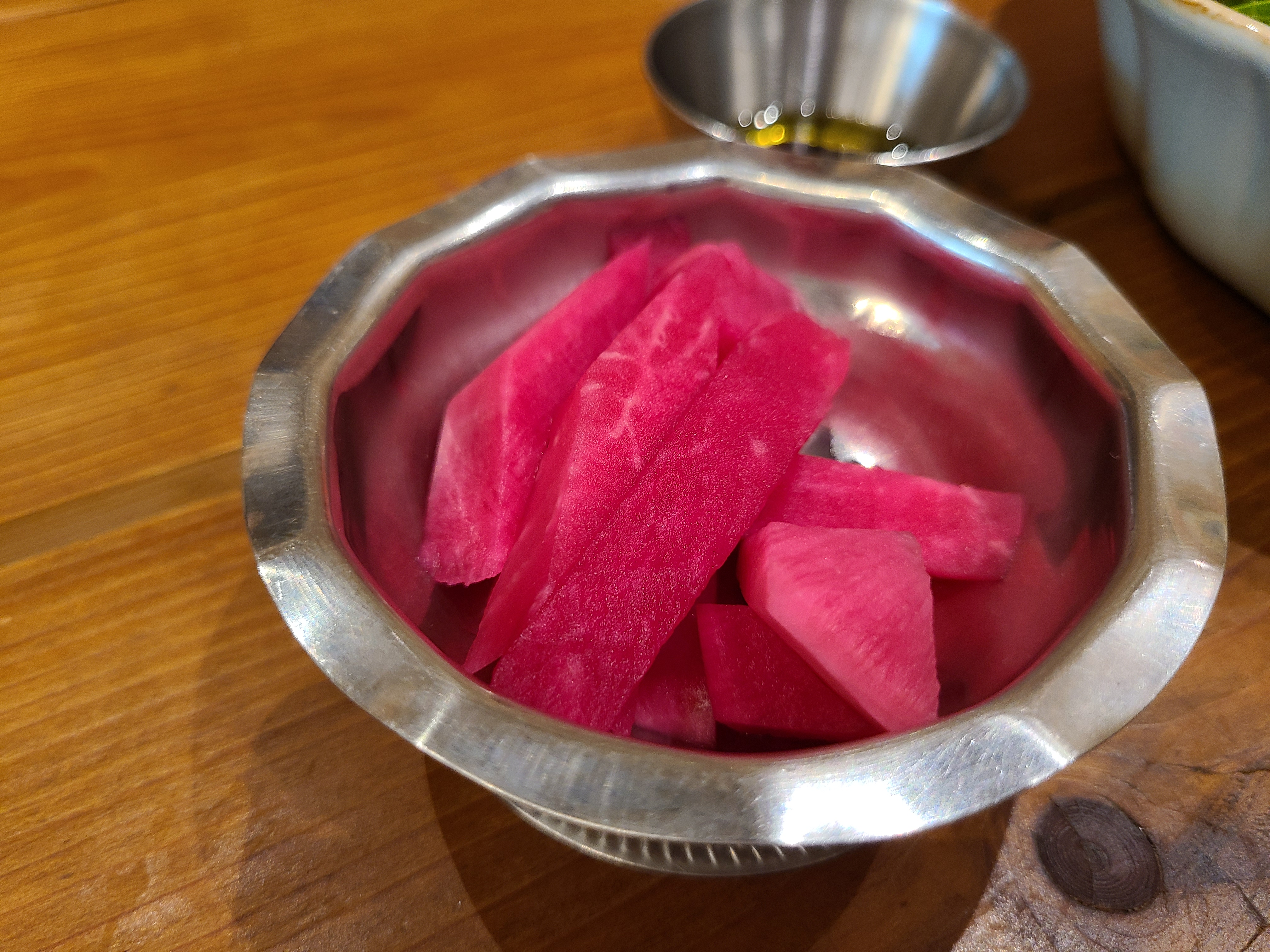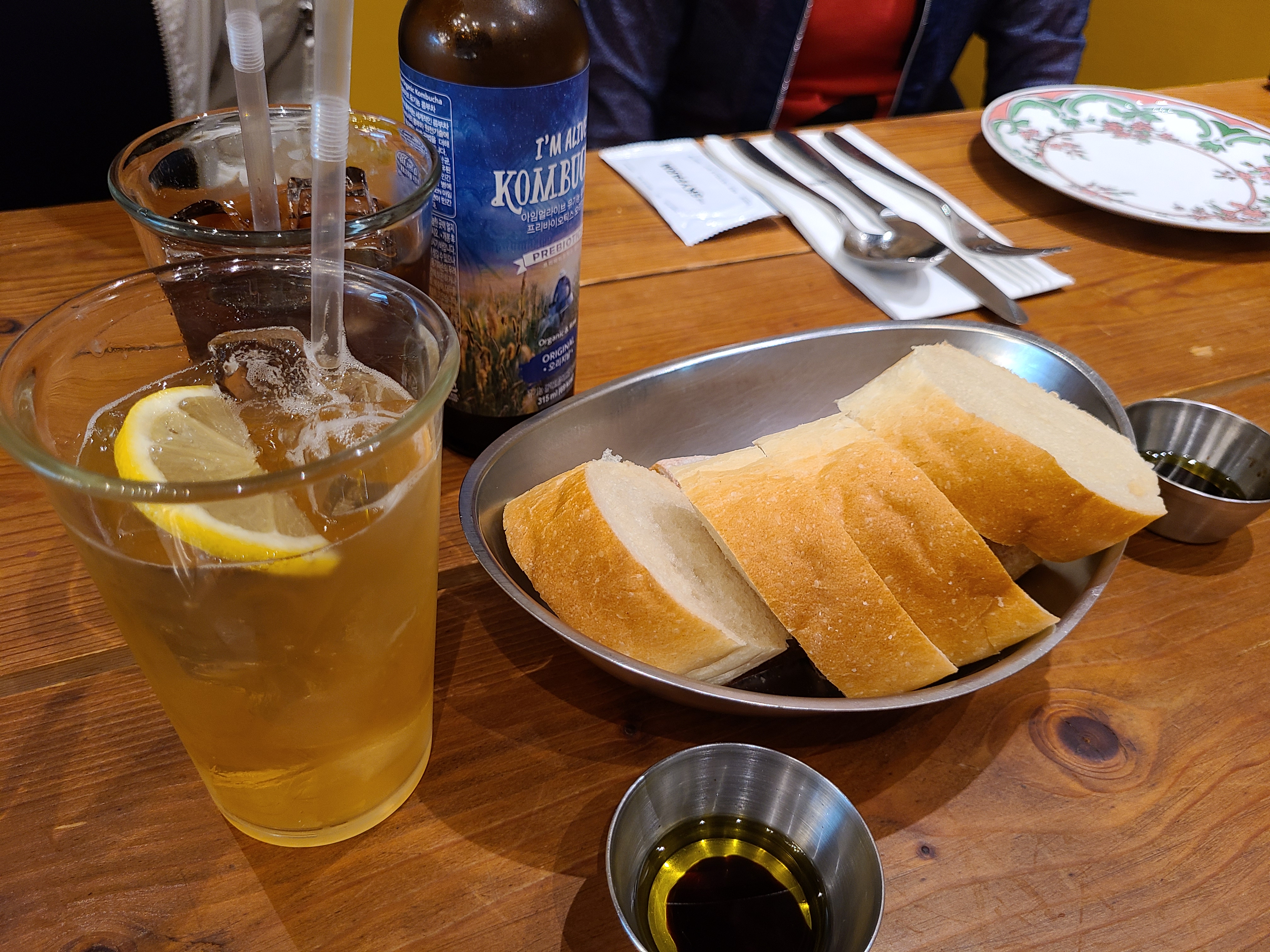 세팅된 접시와 서빙될 때마다 받아드는 접시가 예뻐 기분이 더욱 좋아졌다. 주문한 음료를 먼저 받았다. 내가 주문 한 콤부차 오리지널, 최근 다이어트 음료로 인기가 많은 것 같아 주문했는데 개인적으로는 일반 탄산수가 더 입맛에 맞았다. 그리고 바로 이어 식전 빵과 발사믹 올리브유 소스, 버터가 나왔다. 식전 빵은 따뜻하고 부드러웠고 입맛을 돋아주기에 충분했다.