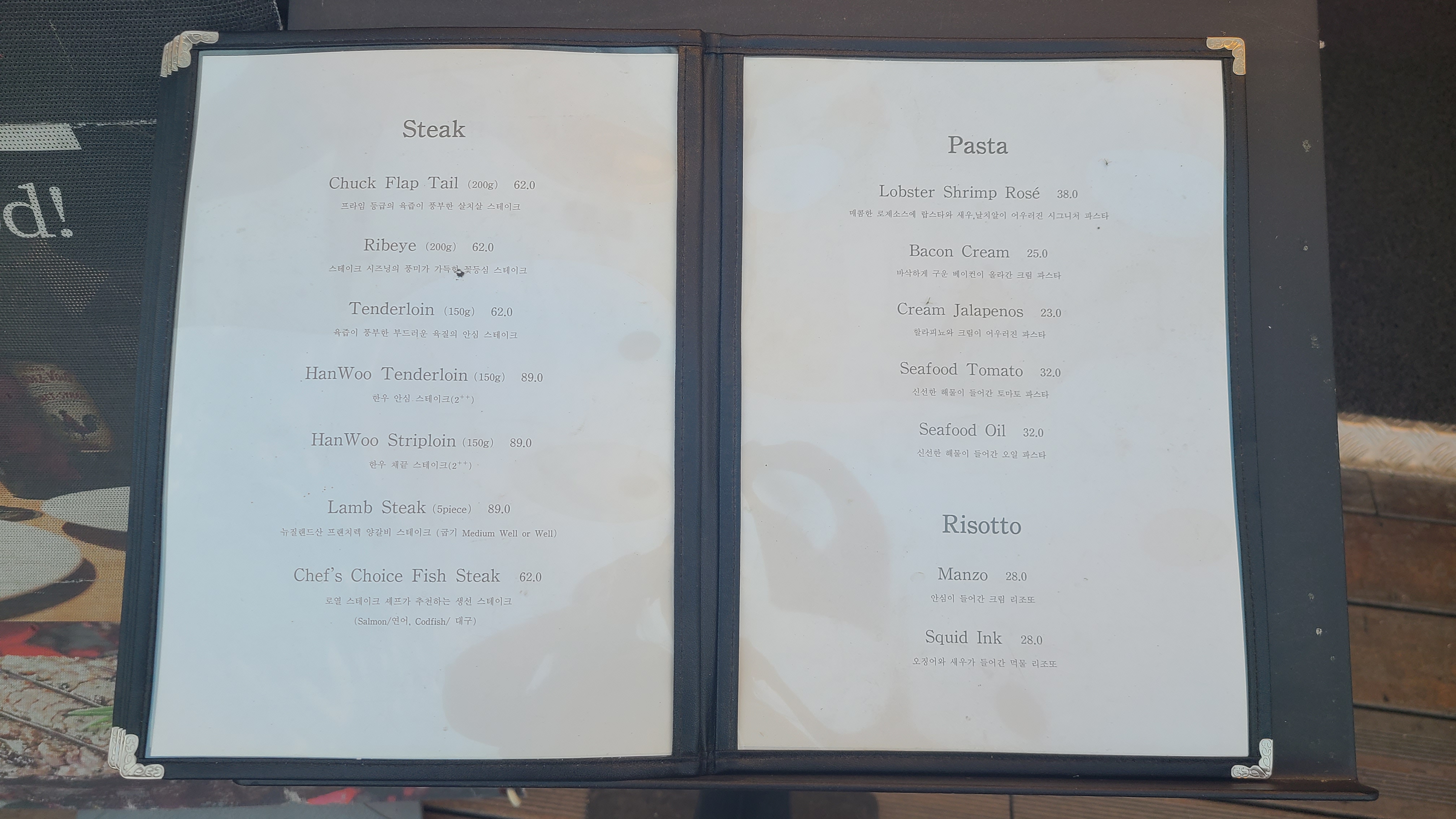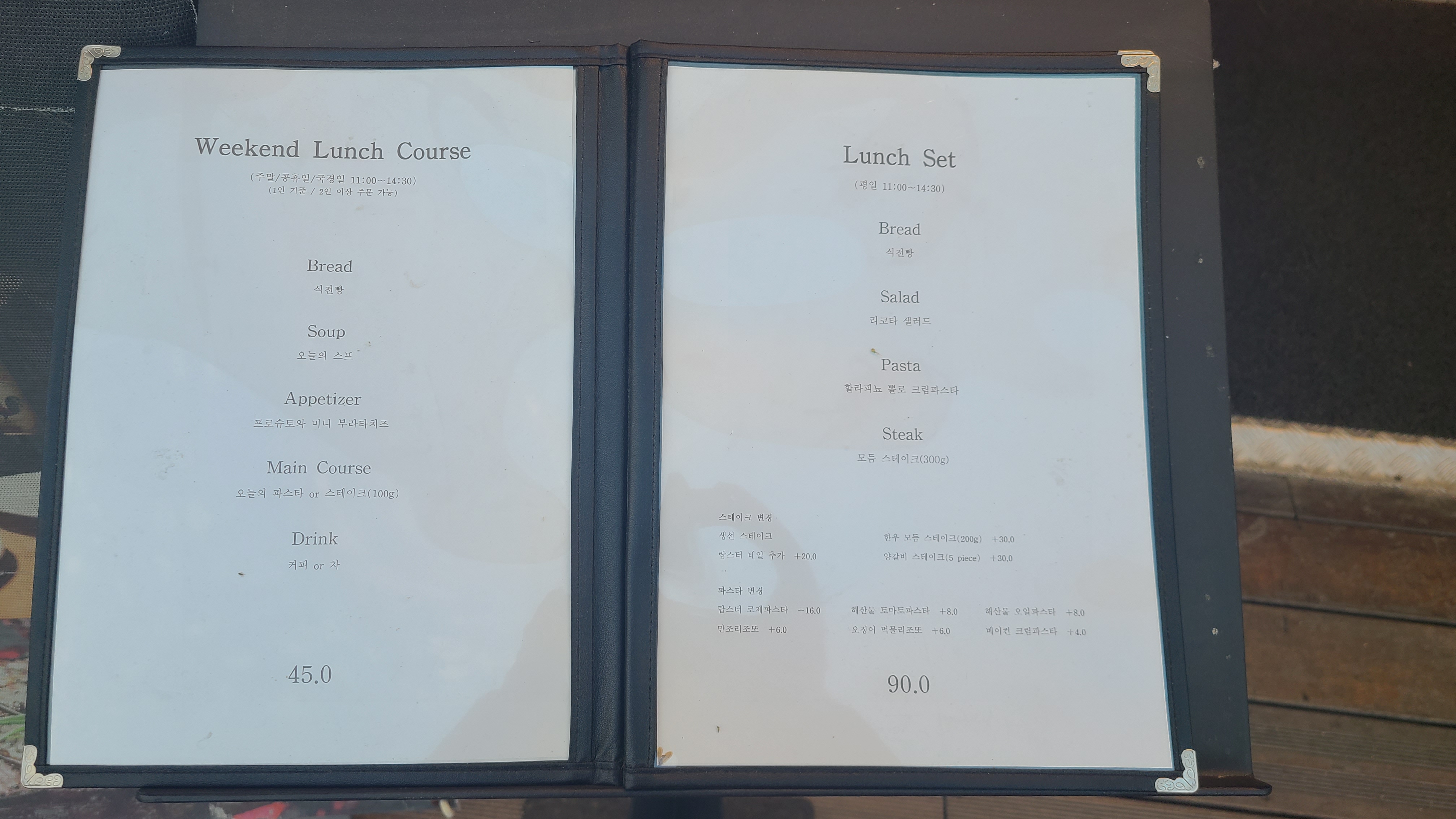 오늘 이 뷰로 충분하다는 생각이 들었다. 더 스테이크하우스 피어 79 로열 스테이크는 저녁시간이 2부로 나누어져 있었는데 우리 집 식구와 나는 5시 - 7시 시간을 예약하고 이용했다. 너무 깜깜한 야경보다는 노을이 지는 시간대를 누리고 싶었는데 탁월한 선택이었던 것 같다. 자리에 앉아 메뉴를 보는데 런치의 구성과 가격이 합리적이라는 생각이 들었다. 한강에서 식사지만 가격 대가 너무 부담스럽지 않은 식사를 하고 싶었는데 가격이 착하다는 생각이 들었다. 우리 집 식구와 나는 로열 세트와 로열 코스 중에 고민을 하다 관자 샐러드가 포함된 로열 코스를 선택했다.
