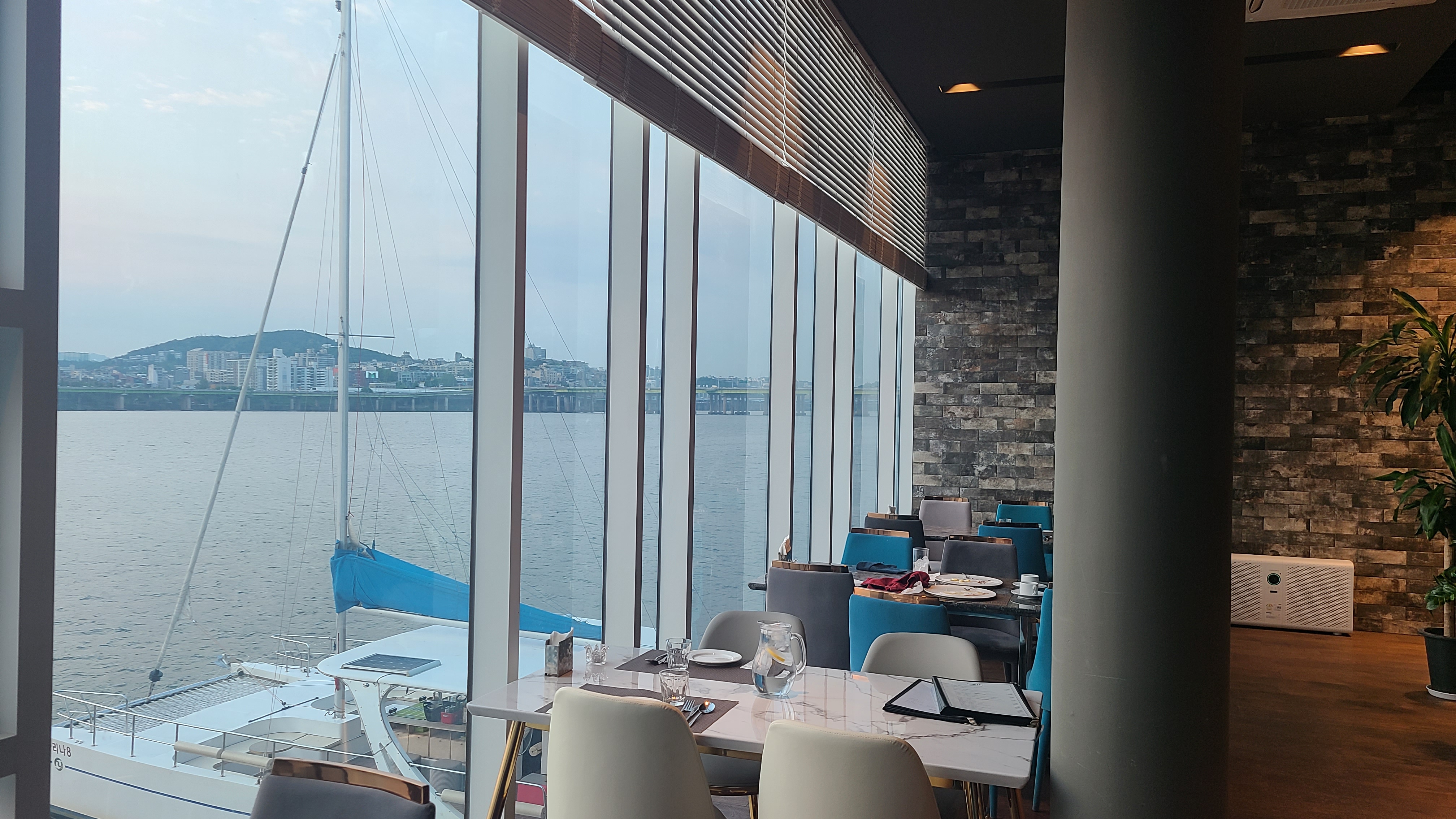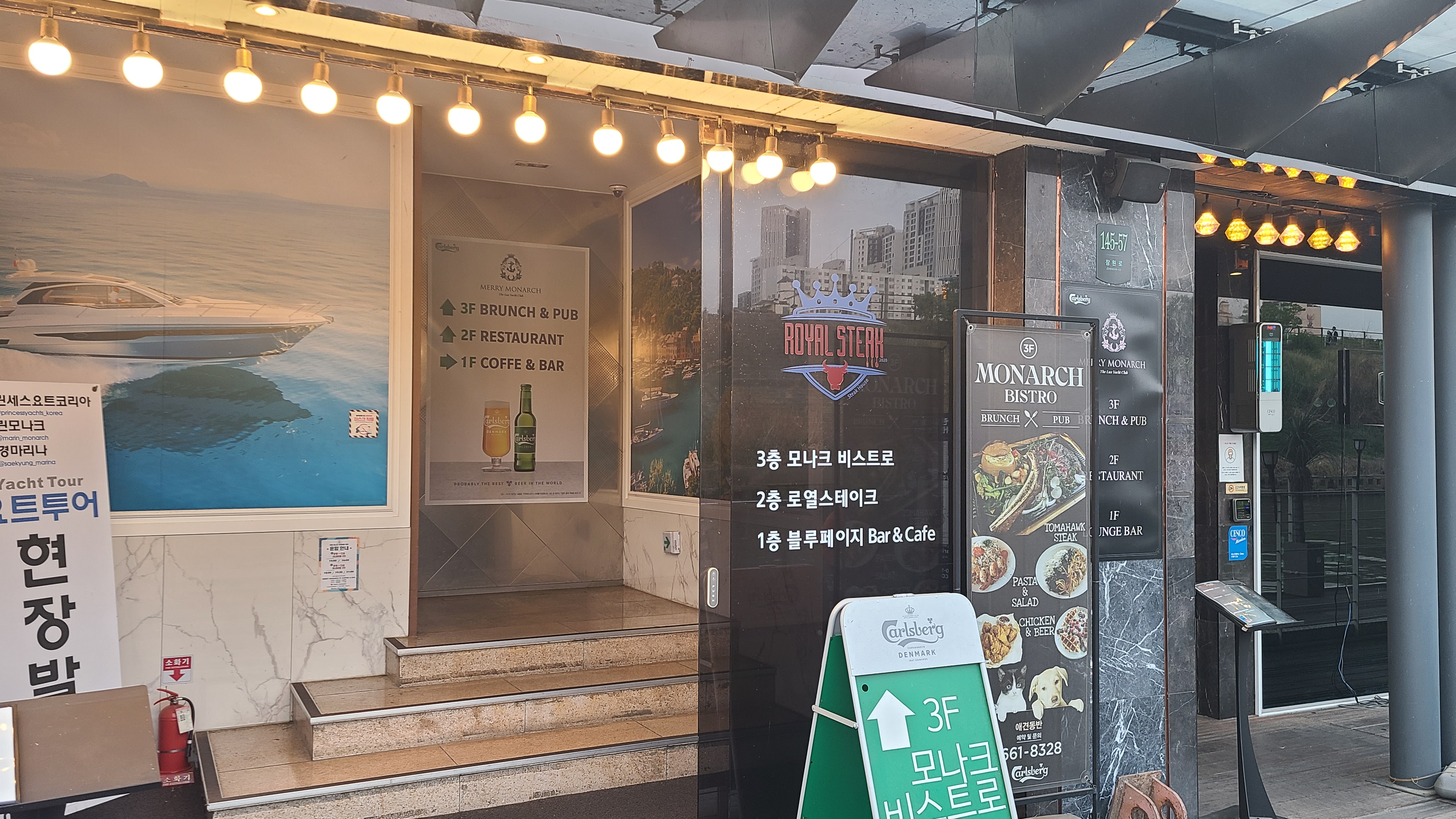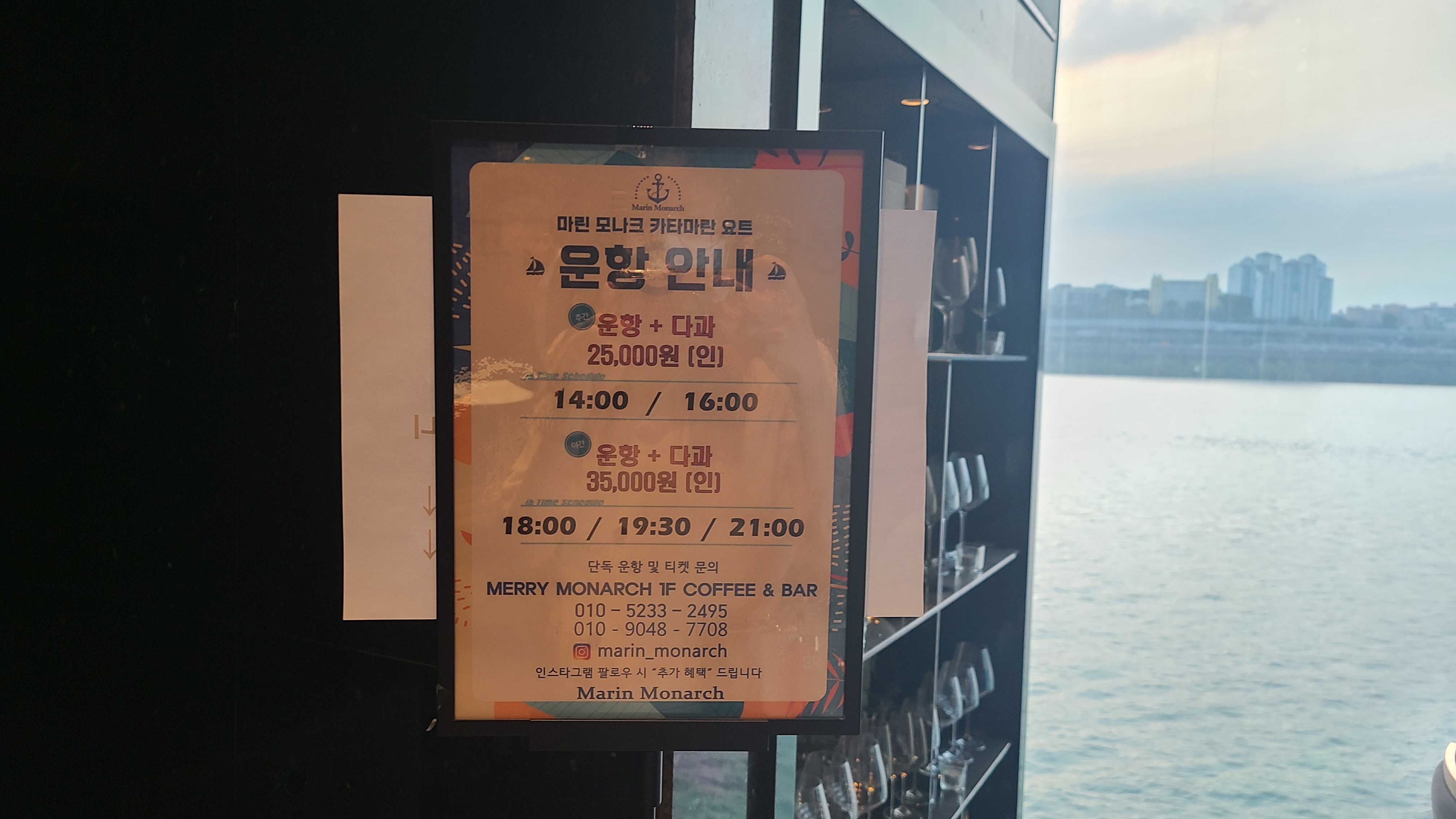 작년 내 생일 우리 집 식구가 한강뷰 식당을 예약했을 때 창가 석이 아니라는 이유로 툴툴 되던 기억이 났다. 이번에는 한달 전 창가로 예약했다는 우리 집 식구의 이야기를 들으며 작년 생일 식당에서 기억이 크게 남았다는 생각이 들었다(우리 집 식구 미안해 ^^;;) 잠원한강공원에 도착해서 주차를 하고 메리 모나크 건물로 향했다. 건물 외관은 약간 오래되어 보였지만, 2층으로 올라가 직원의 안내로 좌석에 앉아 보니 뷰가 정말 마음에 들었다.