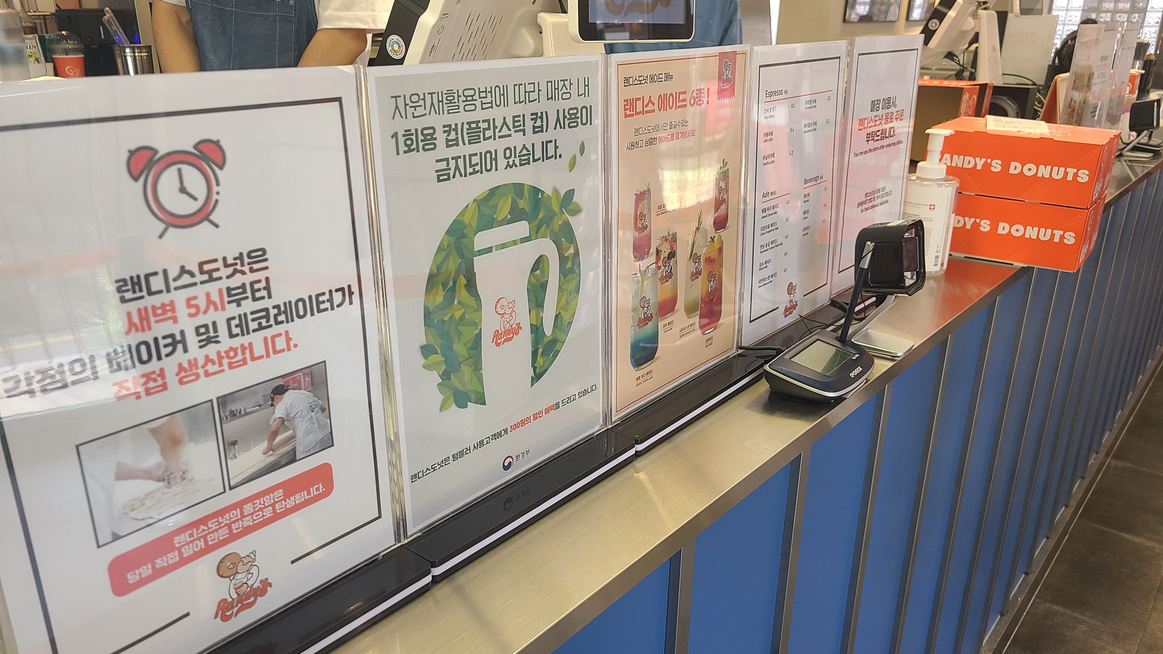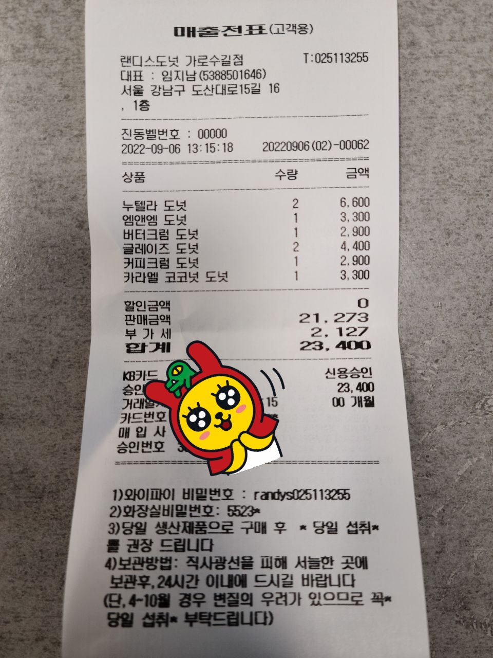랜디스 도넛 하면 생각나는 대형 도넛 모형 앞에서 사진을 찍고 싶었지만 찍어 줄 사람이 없어 아쉬웠다. 음료를 같이 주문해서 매장 안에서 도넛을 먹을 때는 음료를 꼭 주문해야 하는 것 같았다. 매장 출구로 나오니 또 다른 포토존이 있었다. 출구의 포토존을 보고 입구로 착각해 들어갈 뻔했던 것은 안 비밀이다. 매장이 붐비지 않게 입출구가 나누어져 있으니 가로수길점을 방문할 입구를 꼭 확인할 것을 추천한다.