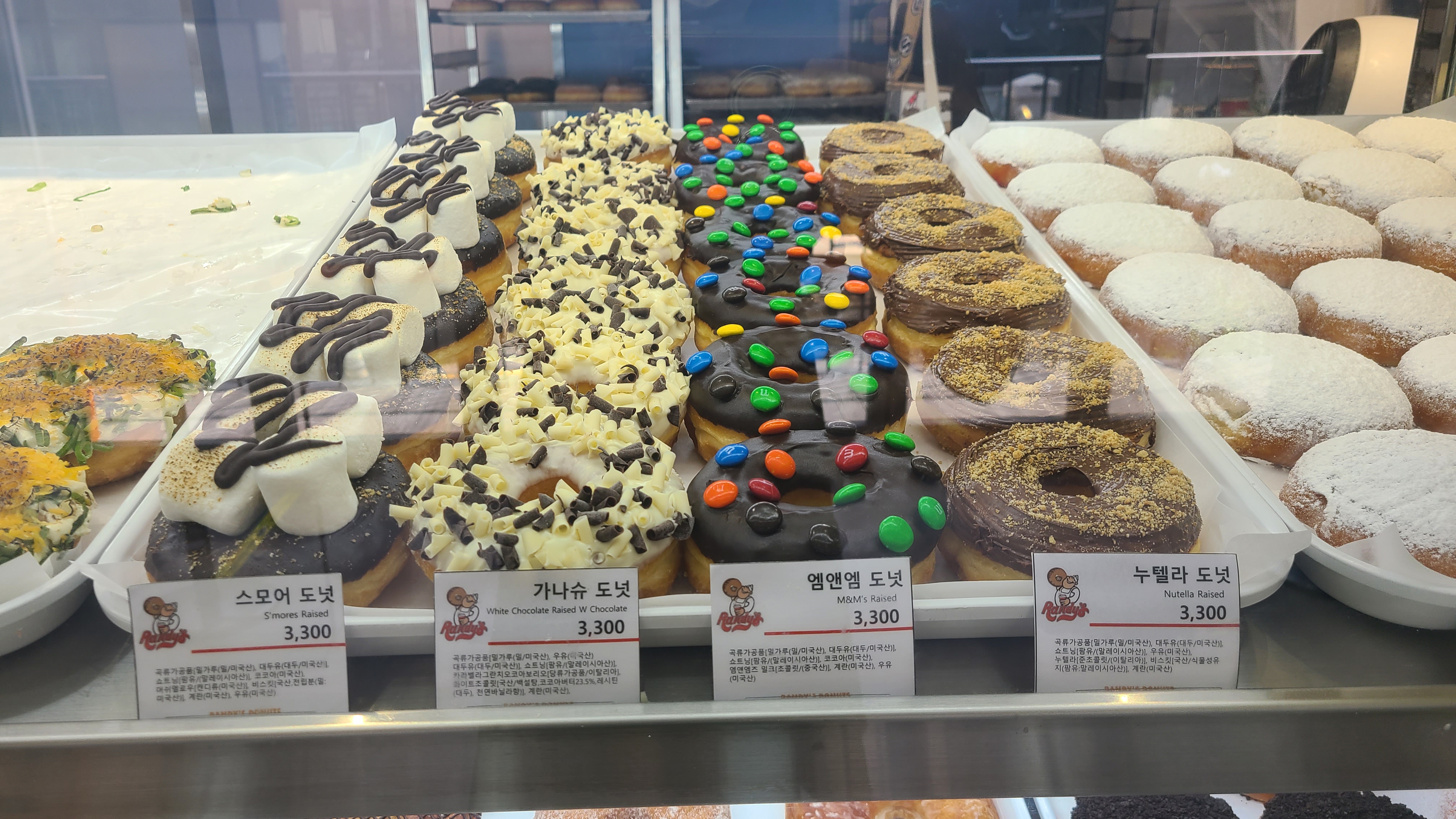 쇼케이스 안에 도넛을 보니 '더 많이 사갈 것을 8개만 주문했나?'라는 생각이 순간 들었다. 달콤한 도넛의 유혹을 뿌리치고 랜디스 도넛의 베스트 메뉴를 참고하여 Classic 라인에서 글레이즈 도넛 2개, Fancy 라인에서 버터 크럼 도넛, 커피 크럼 도넛, Premium 라인에서 누텔라 도넛 2개, 엔앰엔 도넛, 카라멜 코코넛 도넛까지 총 8개 도넛을 선택했다.