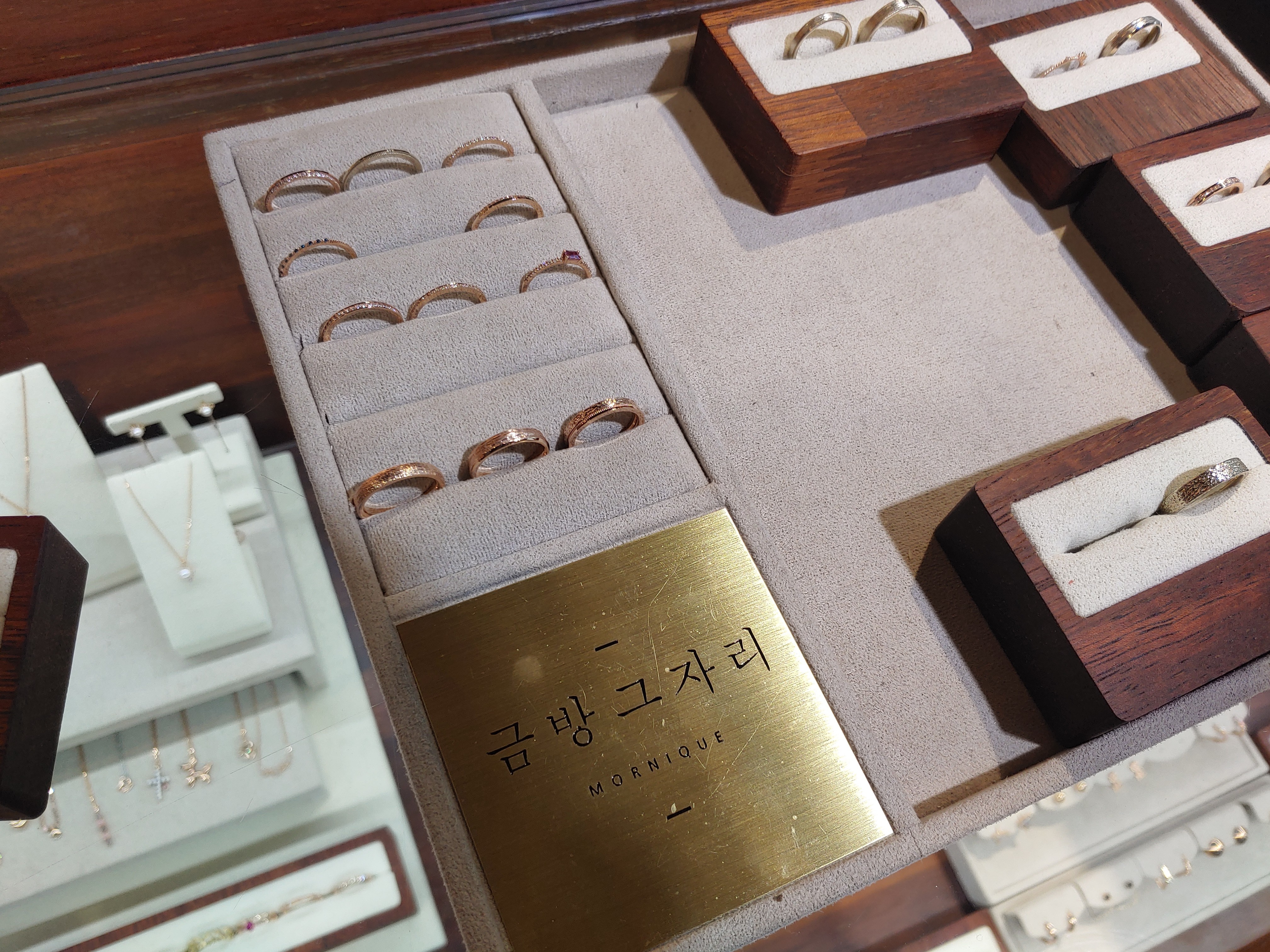 사전에 인스타그램(www.instagram.com/mornique_gold/?hl=ko)통해서 마음에 드는 디자인을 캡처한 내용을 사장님께 전달 드렸더니 사진과 같이 선호할 만한 스타일을 추천해주셨다. 예물을 준비할 때 과하게 반지 디자인을 보여주시고 결정을 하지 않으면 불편해하는 모습을 여러차례 봐왔기에 많이 보여주지 마세요. 극구 만류했지만 사장님께서 부담갖지 마시고 편히 보시라며 편안하게 해주셔서 결정에 큰 도움이 되었다.